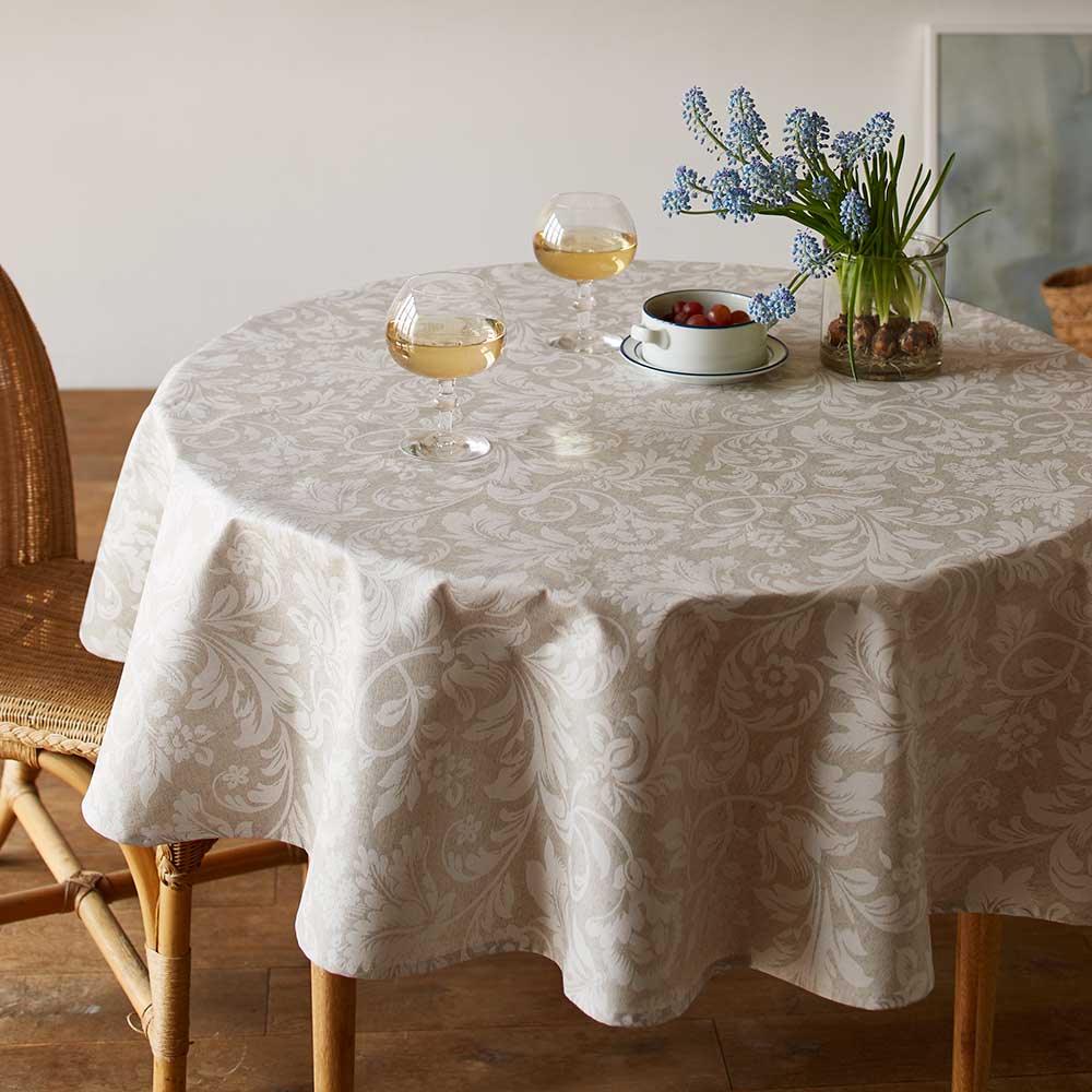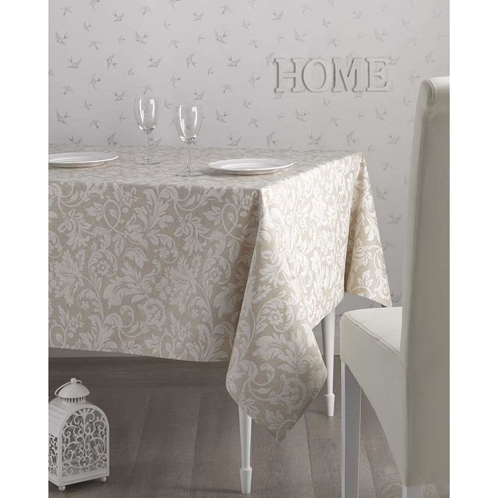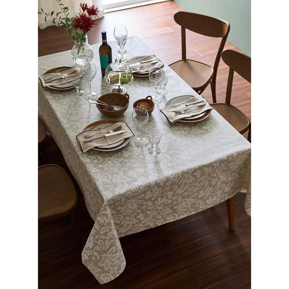 スペイン製の上質スタイルのテーブルクロス。伝統的なアラベスク柄は洗練されたテーブルコーディネートにも映えます。