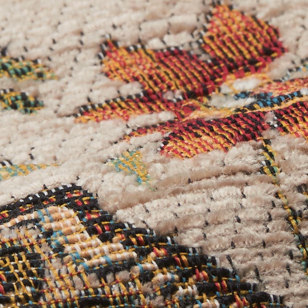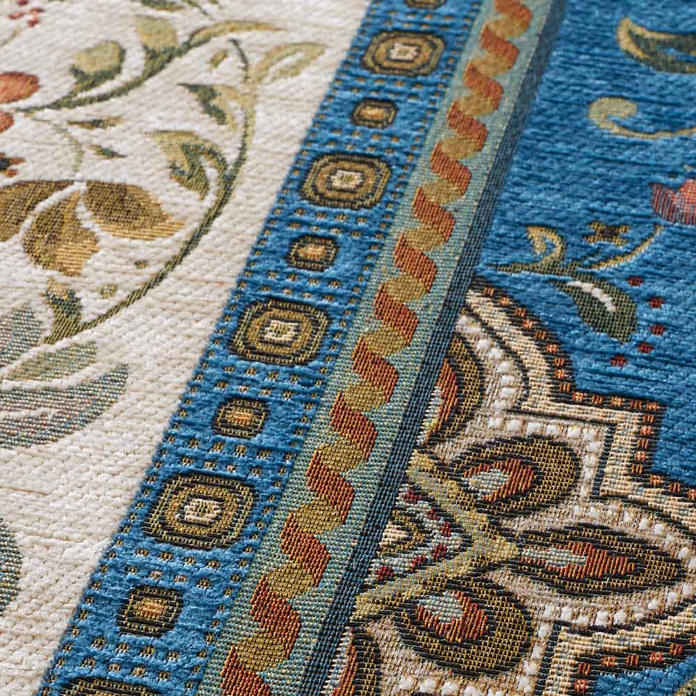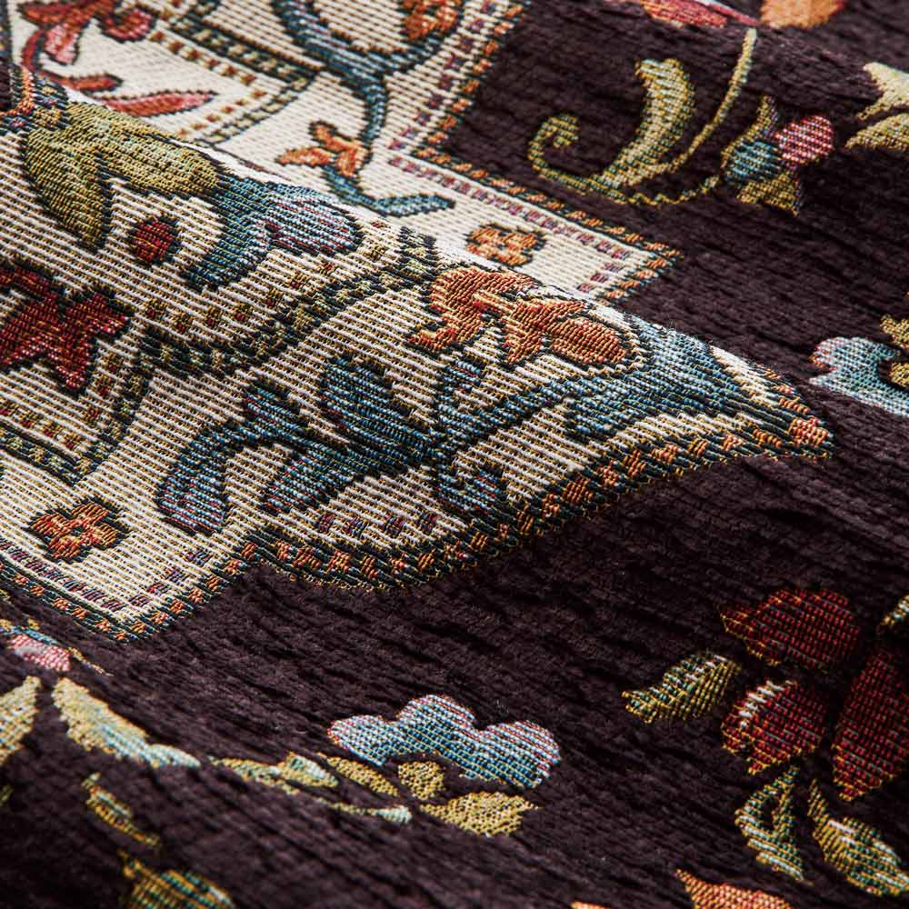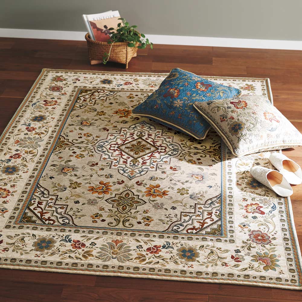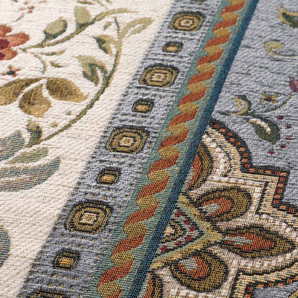 ジャカード織機で織られた織物です。立体的で複雑な柄を作ることができます。織物のため比較的薄手で床との段差もできにくく、折りたたみもしやすいので使わないときの収納にも便利です。