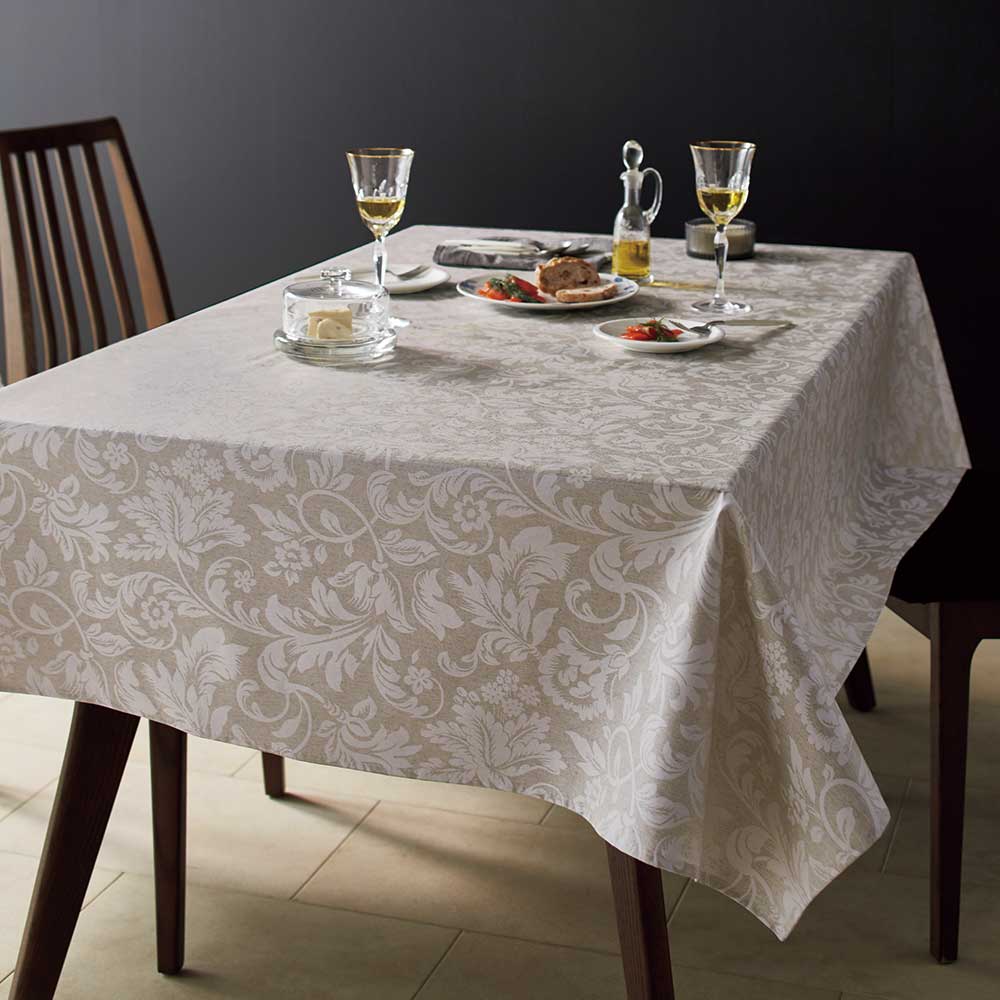 スペイン製の上質スタイルのテーブルクロス。伝統的なアラベスク柄は洗練されたテーブルコーディネートにも映えます。