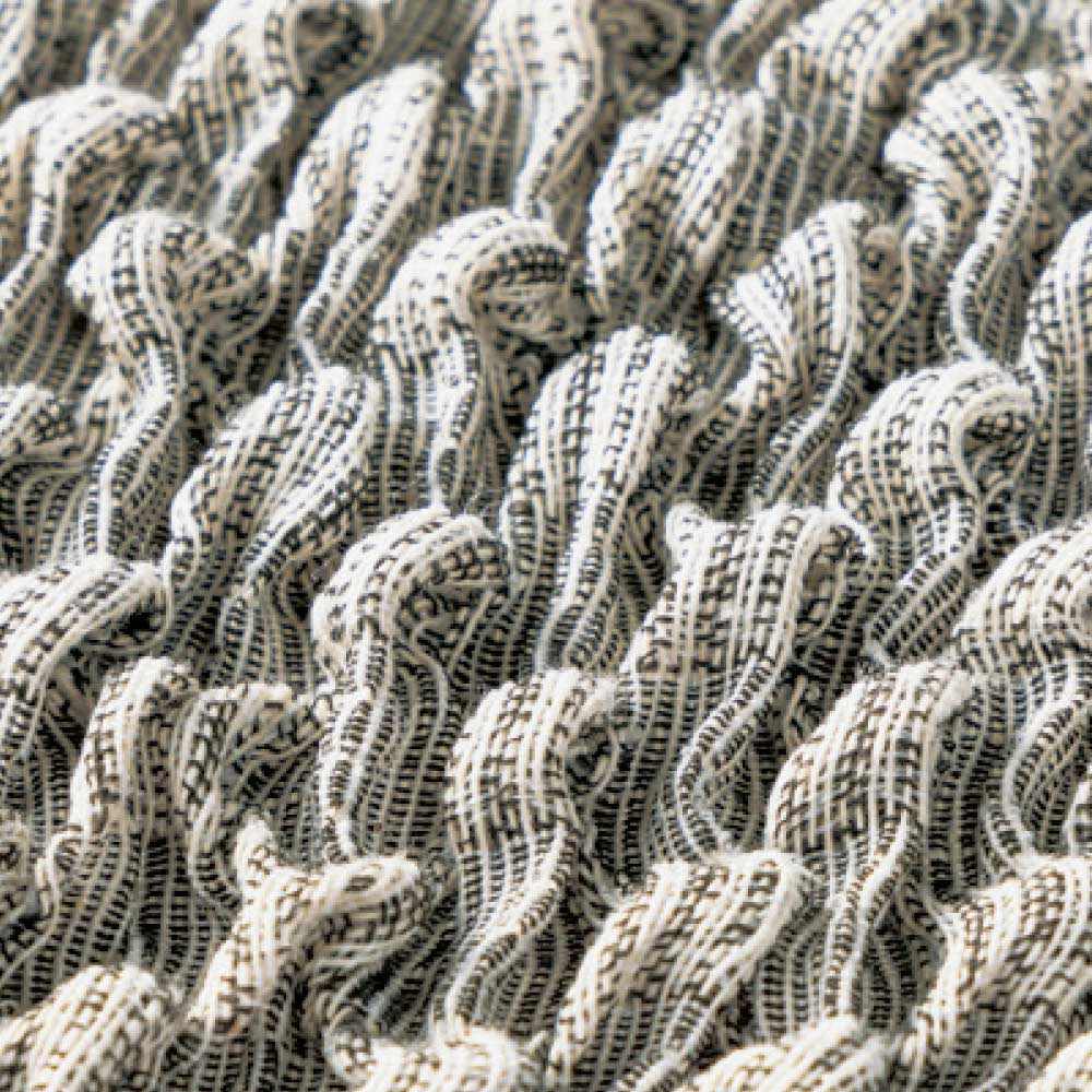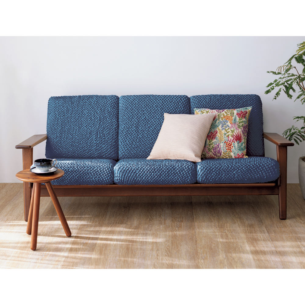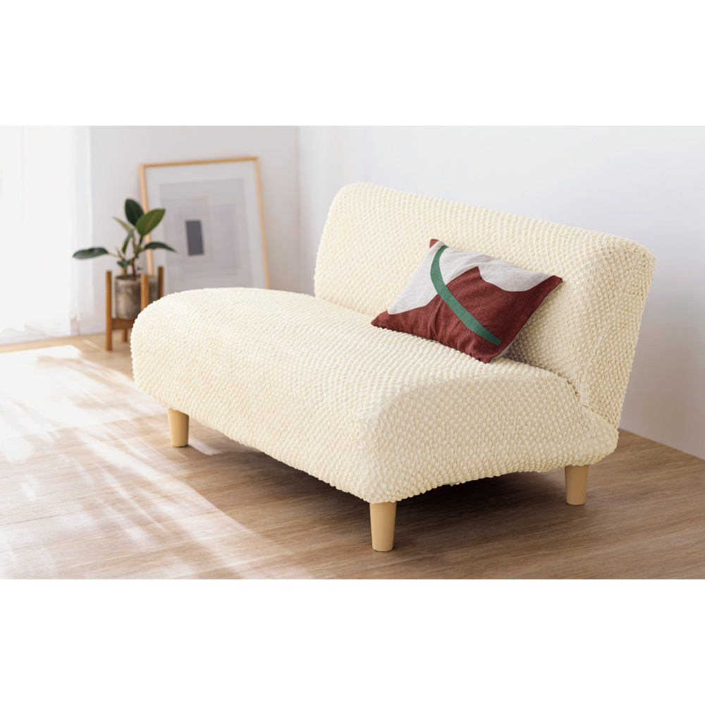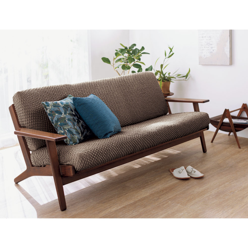 裏側に細かくゴムを張り巡らせた、独自の高い伸縮性を持つストレッチ素材。タテ・ヨコによく伸び、全周ゴム仕様で着脱簡単。ソファに掛けて余った布を隙間に押し込むだけでピッタリフィットします。取り外し簡単なカバーだからこそ叶う、季節や気分に合わせた手軽なイメージチェンジを。【ポイント3】ポコポコした凹凸で掛けるだけでまるで新品