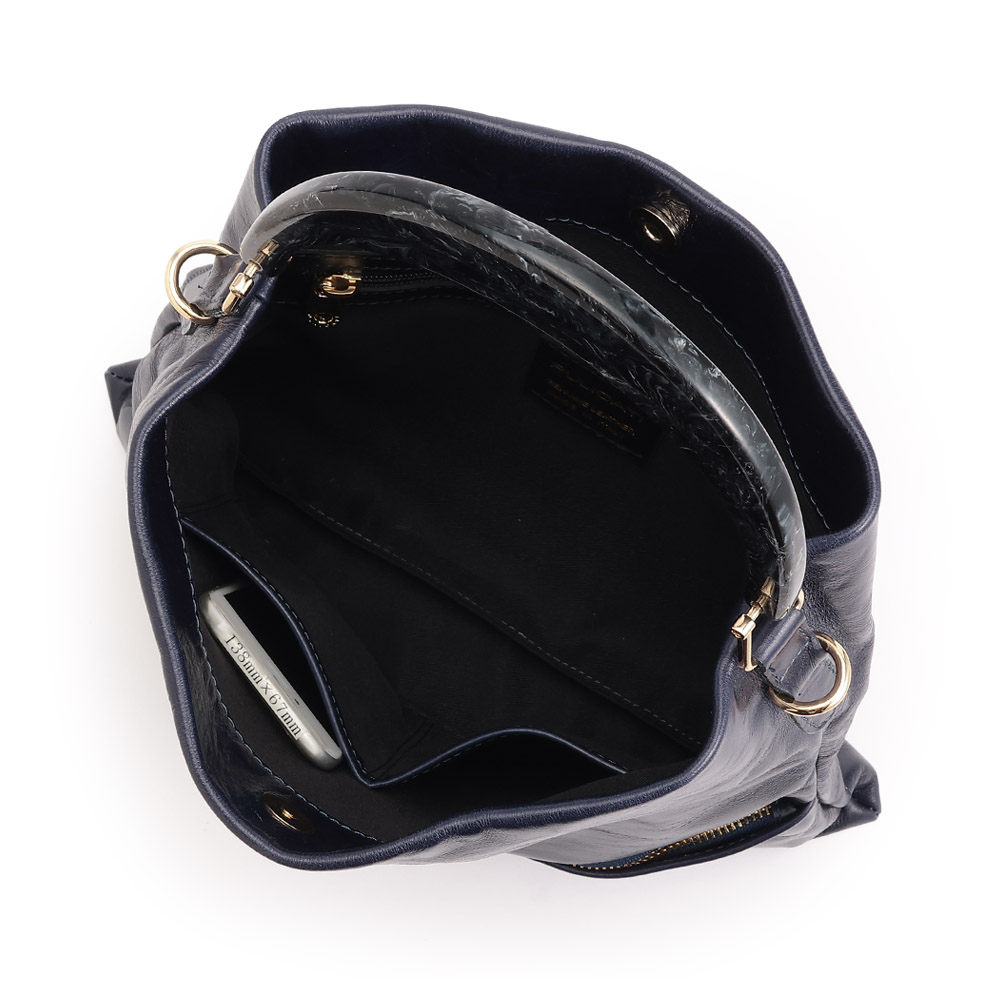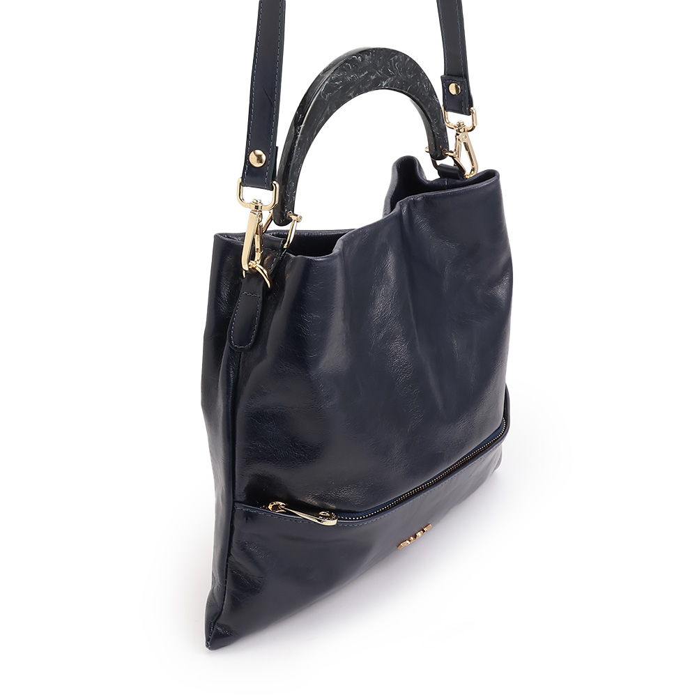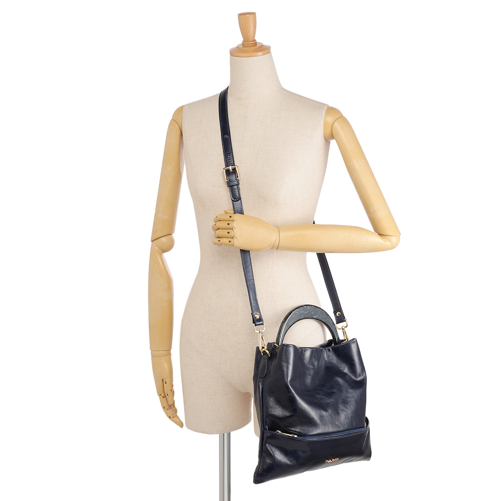 きれいめにまとめたいときは、レザーアイテムでハクを演出してみては?ショルダーストラップつきで、気分やシーンに合わせてアレンジできる2WAYタイプ。牛革を使用し、小ぶりな台形シルエットがこなれ感たっぷり。アクセントになるマーブルカラーのアクリルハンドルも秀逸です。冬のコーディネートになじむ、深みのあるボルドーとネイビー2色をご用意。