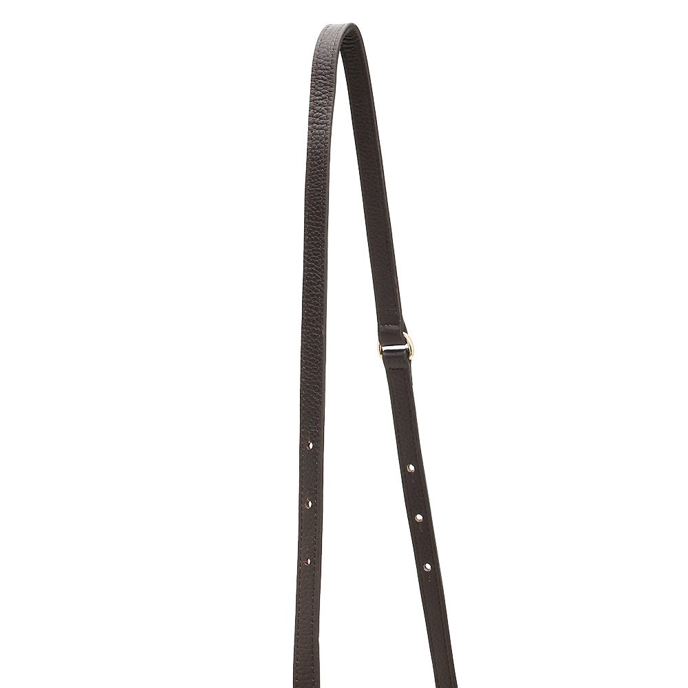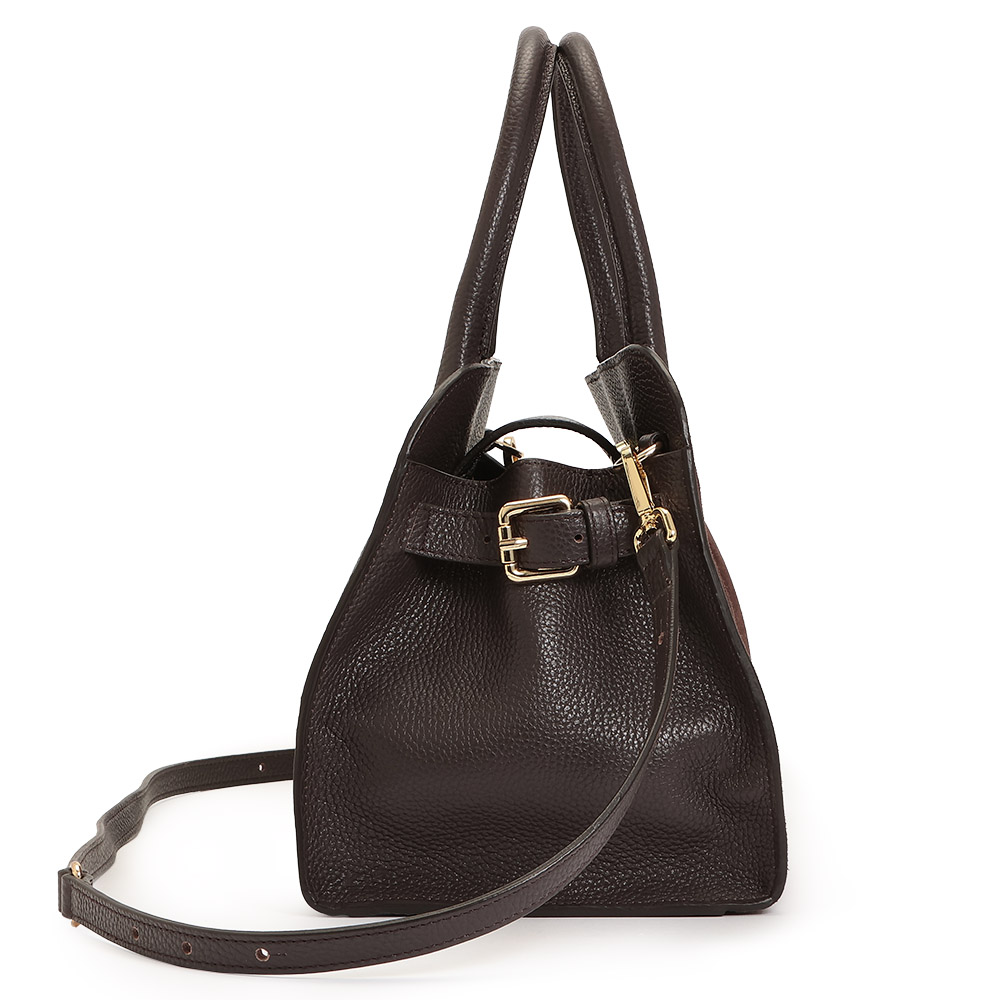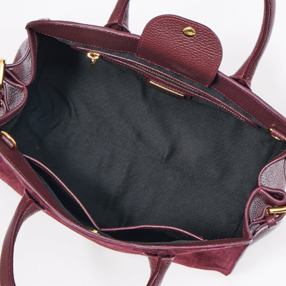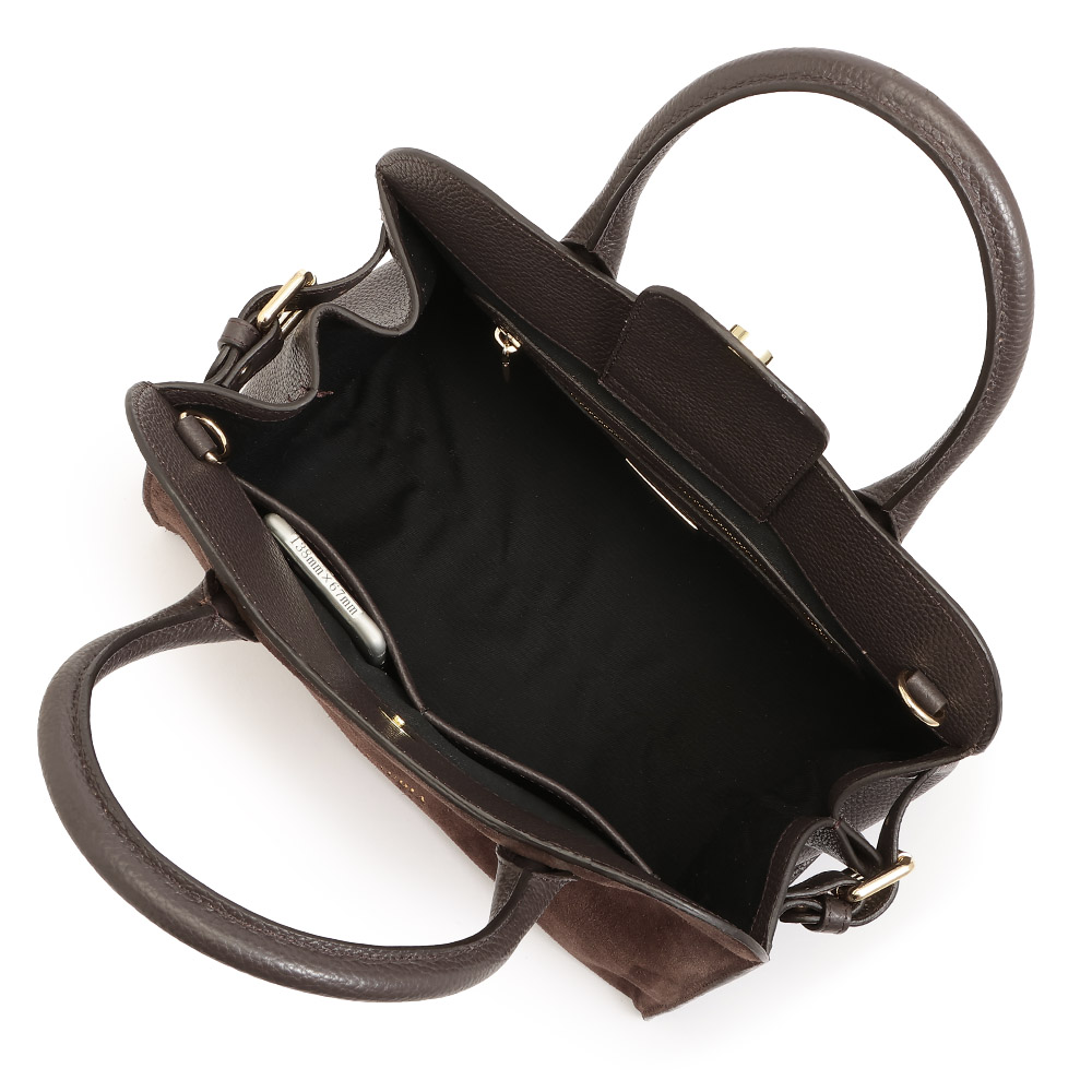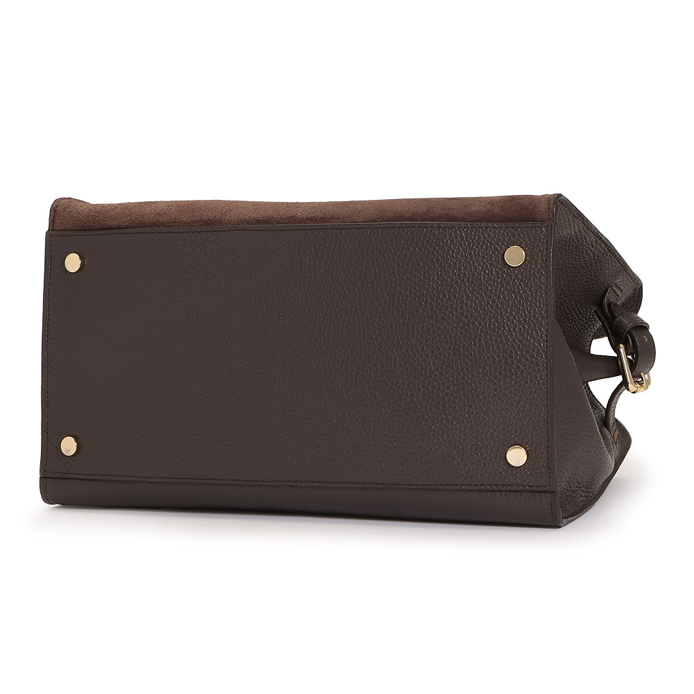前胴のみスエード、他はシュリンク型押しレザーを使ったバッグ。幅広のマチや様々な内ポケットで頼もしい収納力が。サイドベルトやベロホックなど、細かな作りにイタリアらしいセンスを感じます。商品画像の説明。