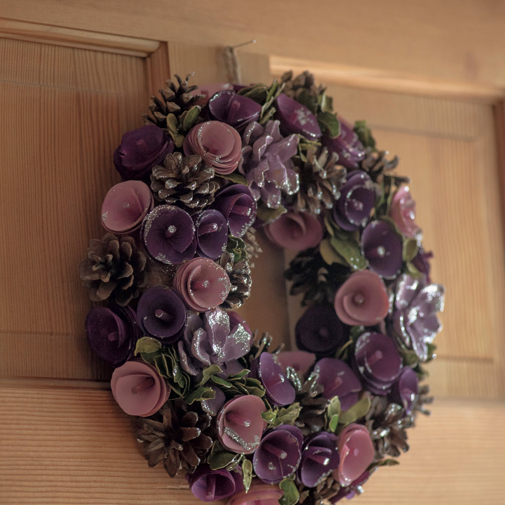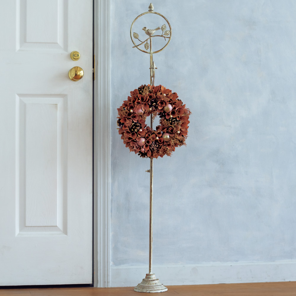 紫とモーブピンクを基調に、ドライフラワーや木の皮などの天然素材をふんだんに使用したナチュラルなリース。別売りの小鳥付きのリーススタンドとも相性が抜群です。