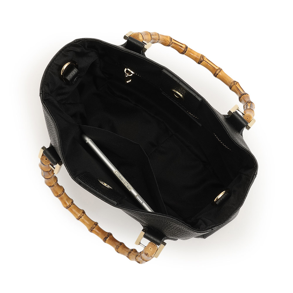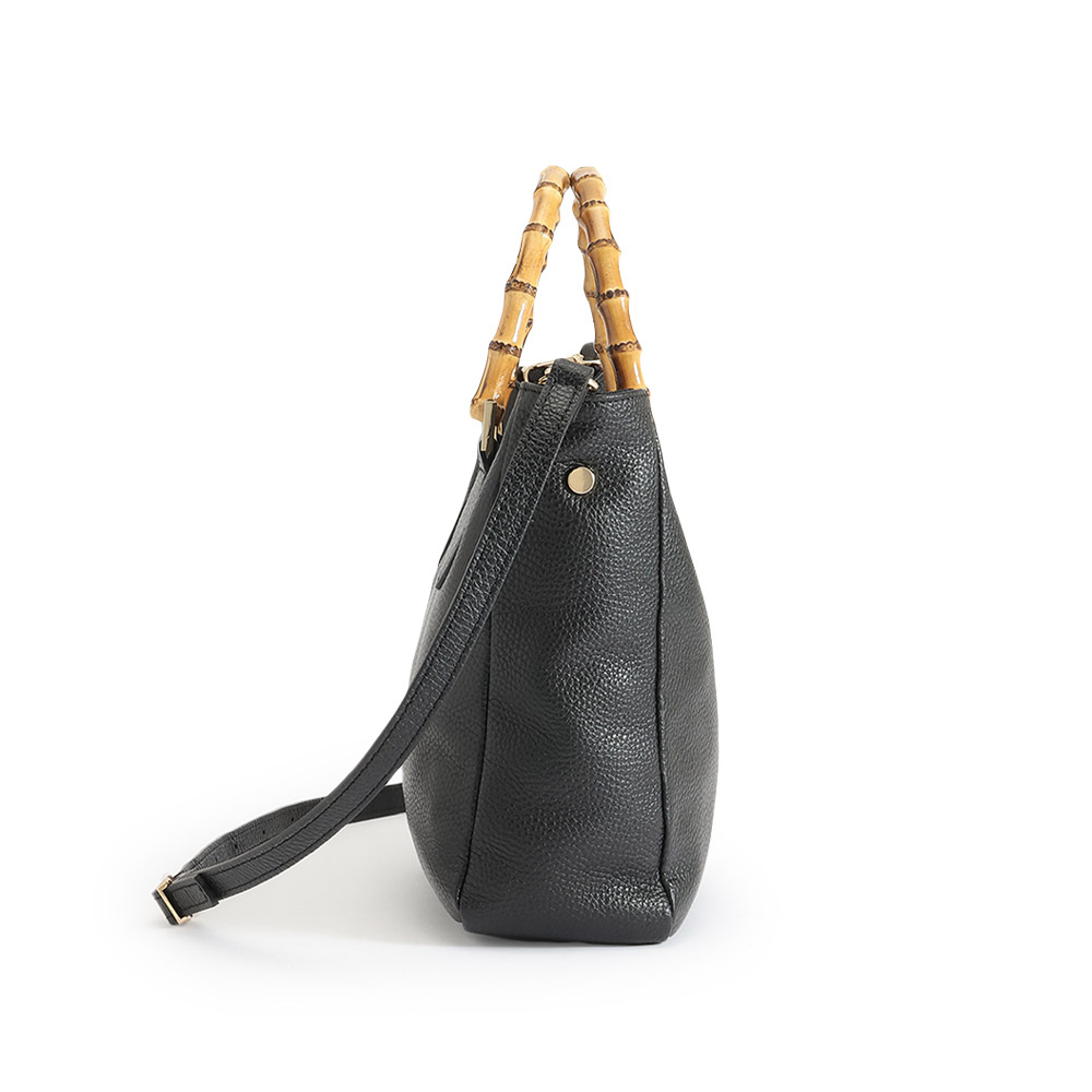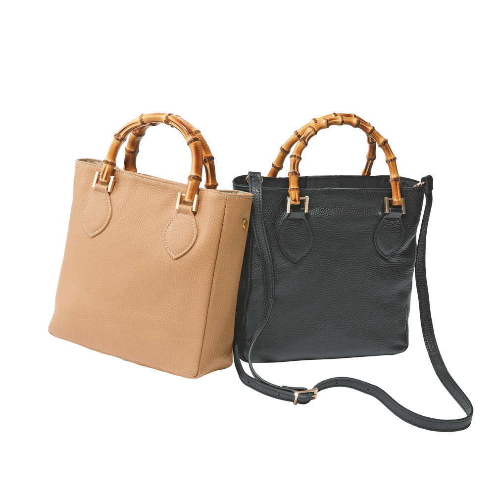 季節感があるバンブーハンドルで、取り外し可能のショルダーストラップつき。マチがあり、使い勝手のよいサイズで収納力に優れています。開閉口はマグネット式で安心。ソフトな牛革にシュリンク型押しをほどこし、使うほどに風合いが楽しめるトートバッグです。カラーはコーディネートしやすいブラックとキャメルの2色をご用意。商品画像の説明