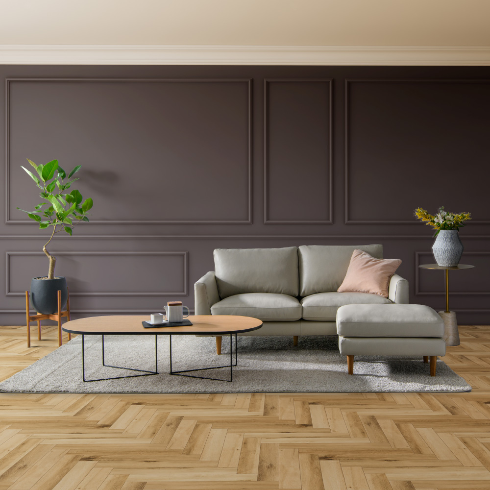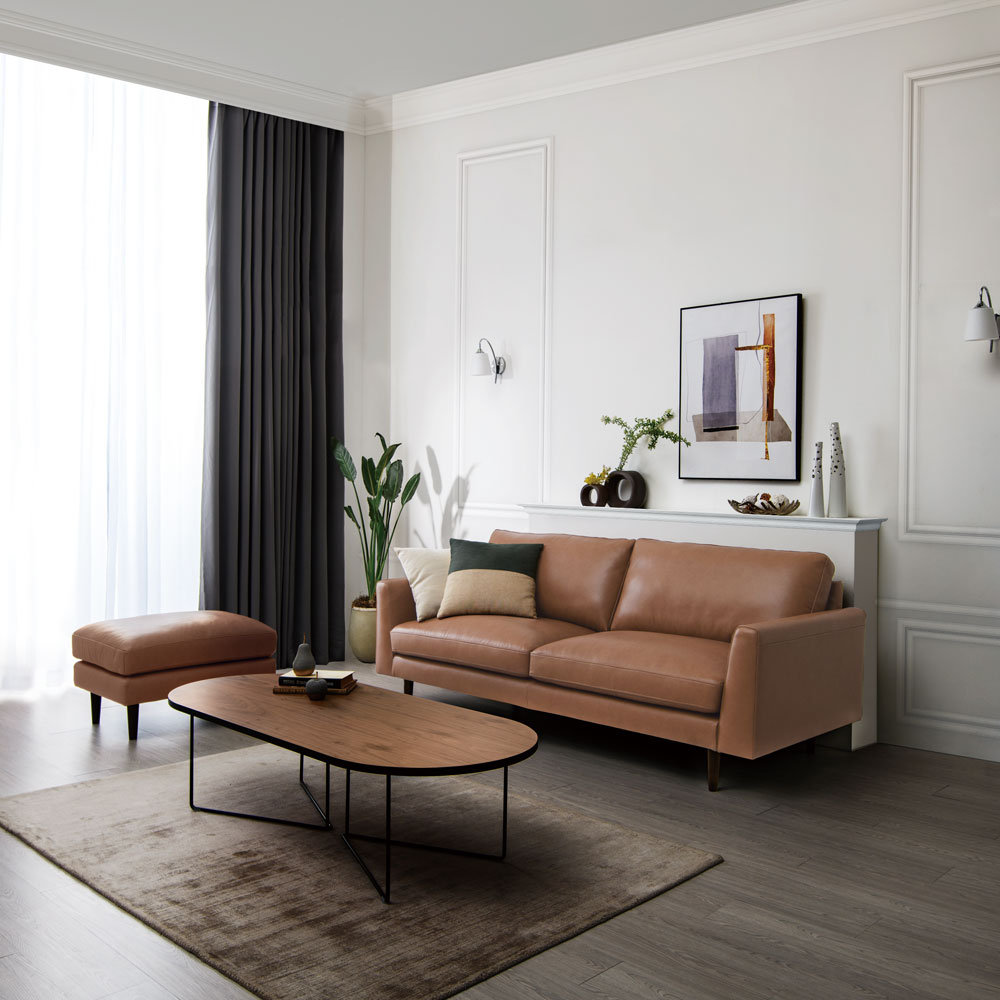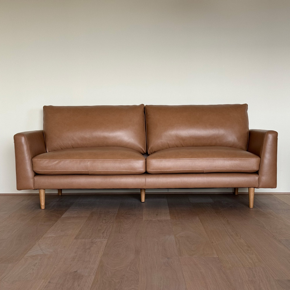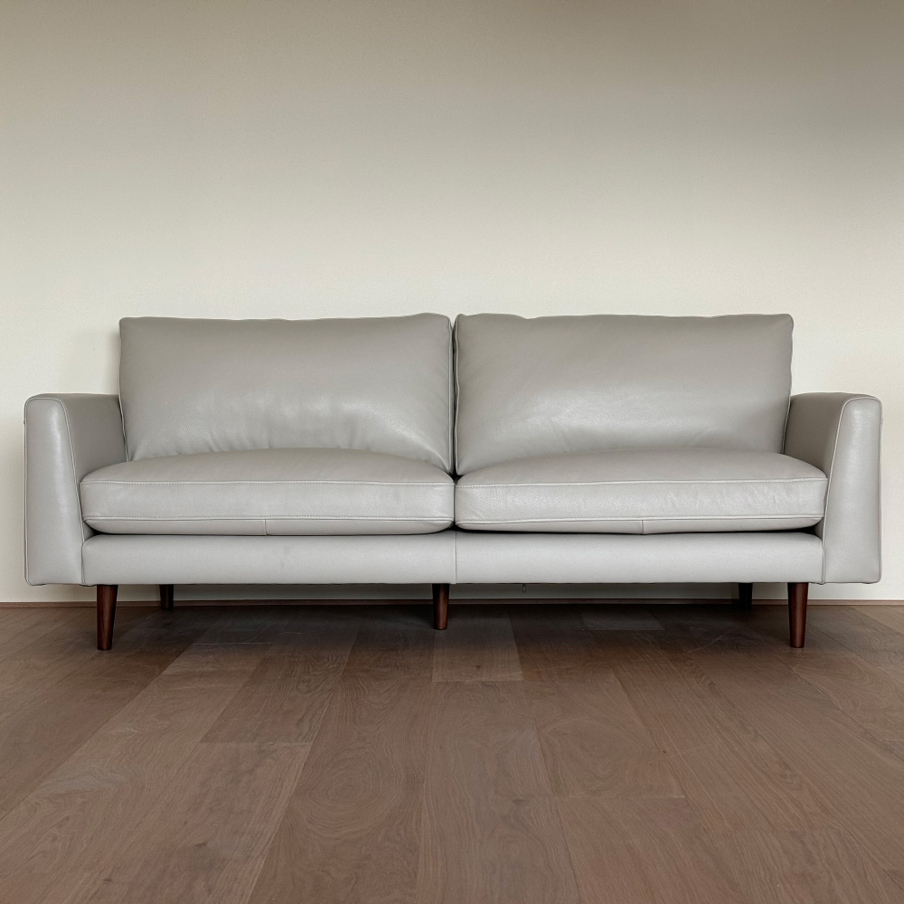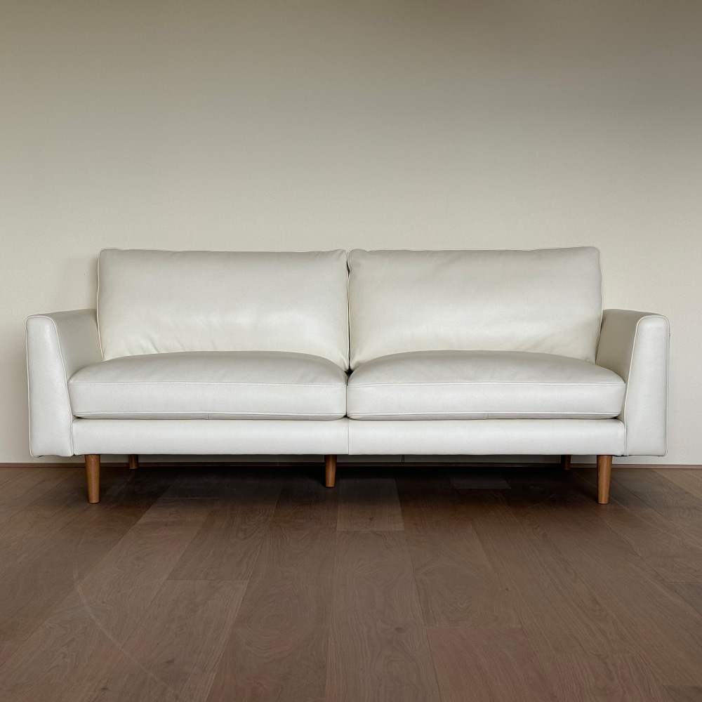 このソファは、エコに配慮しながらも高級感を損なうことのないデザインを追求しました。本革のトップレザー部分は、牛革の質感を十分に愉しめるセミアニリン仕上げを施し、高級感と耐久性を兼ね備えています。
