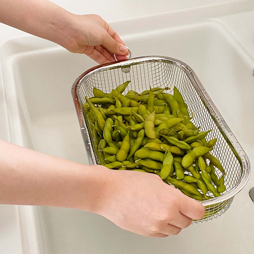 底がフラットなのでザルとしても使えます。ほうれん草などの青菜を茹でるときに切らずに長いまま荒熱取りをしたり、たっぷりの枝豆も食材が重ならないのすっきり湯切り&荒熱取りができます。キッチン台にすっきりフィット|シーンに合わせて選べる