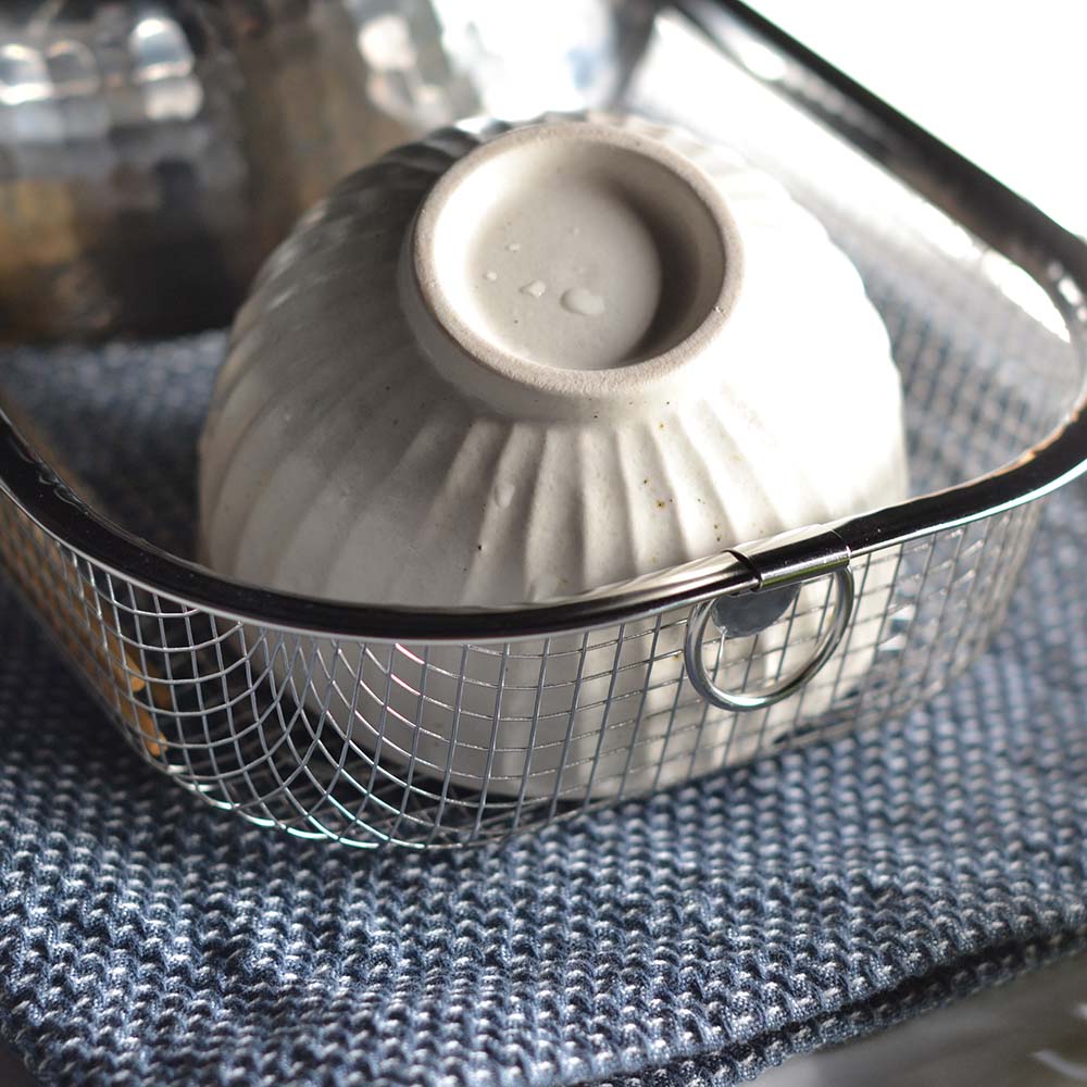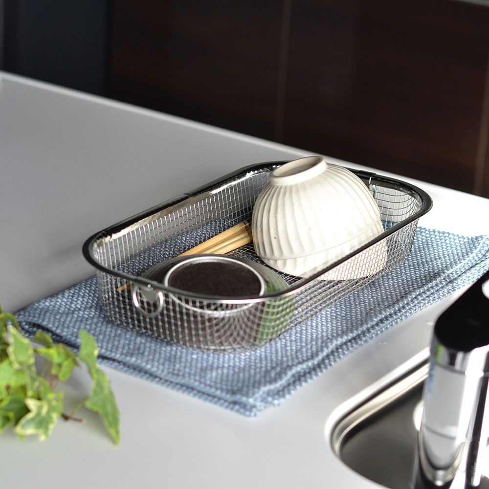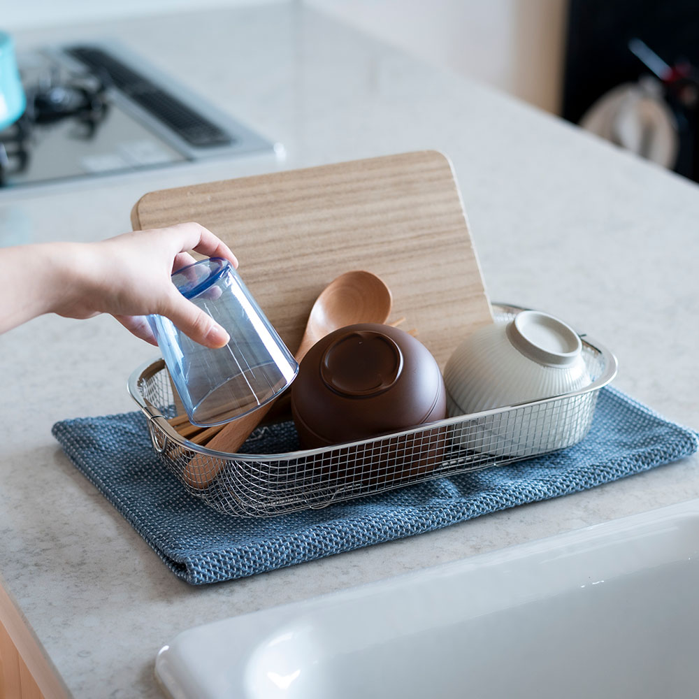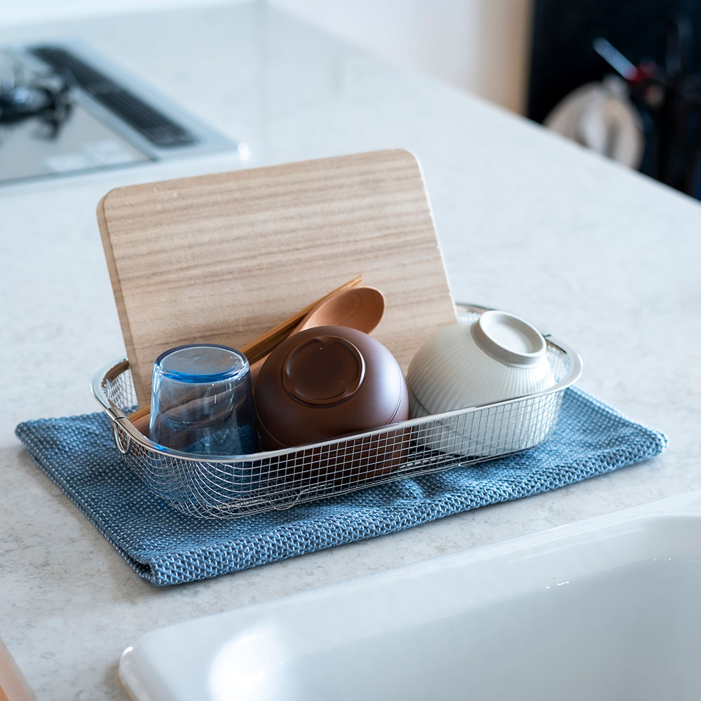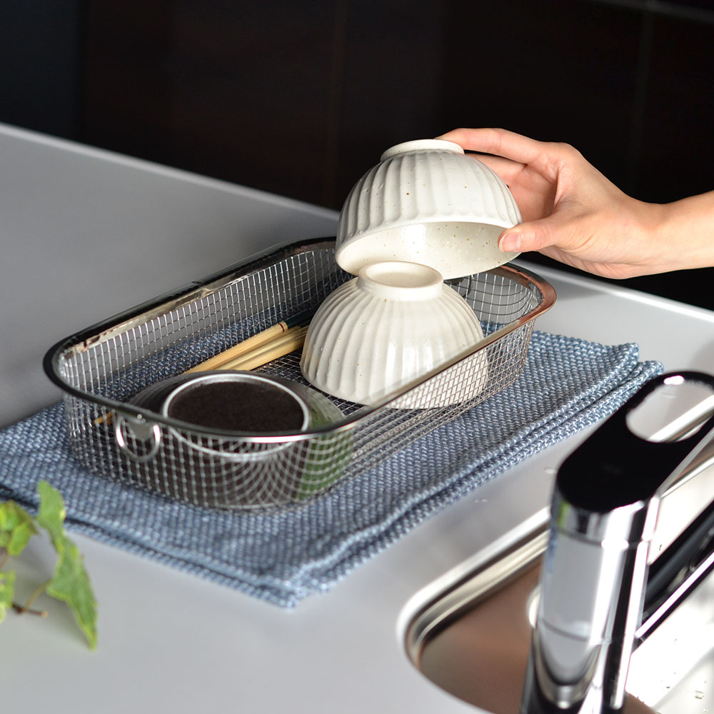 脚付き設計なので、下に敷いたタオルに食器が触れず、乾きも早く衛生的。また絶秒な網目で水切れもグッド!引っかけて収納可能