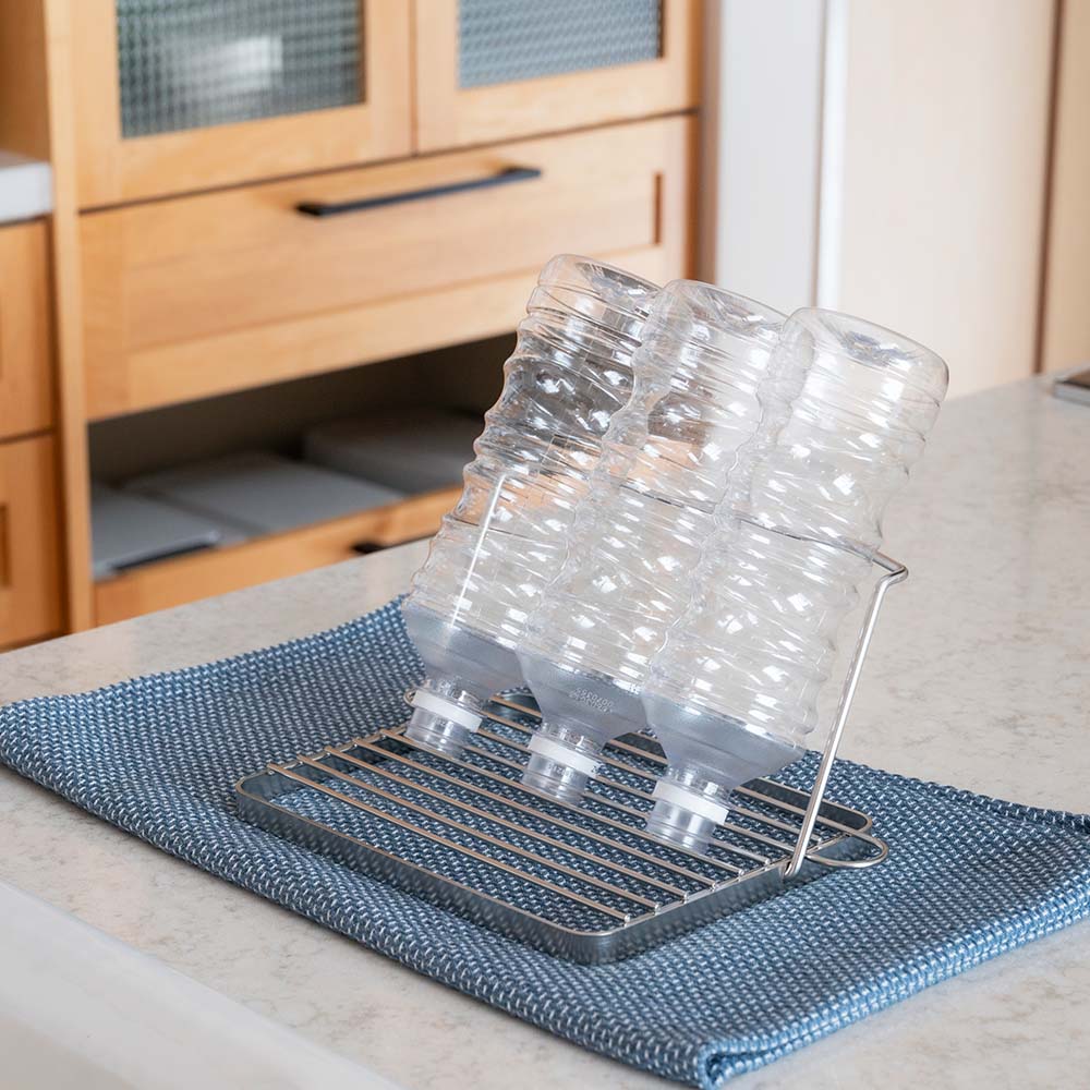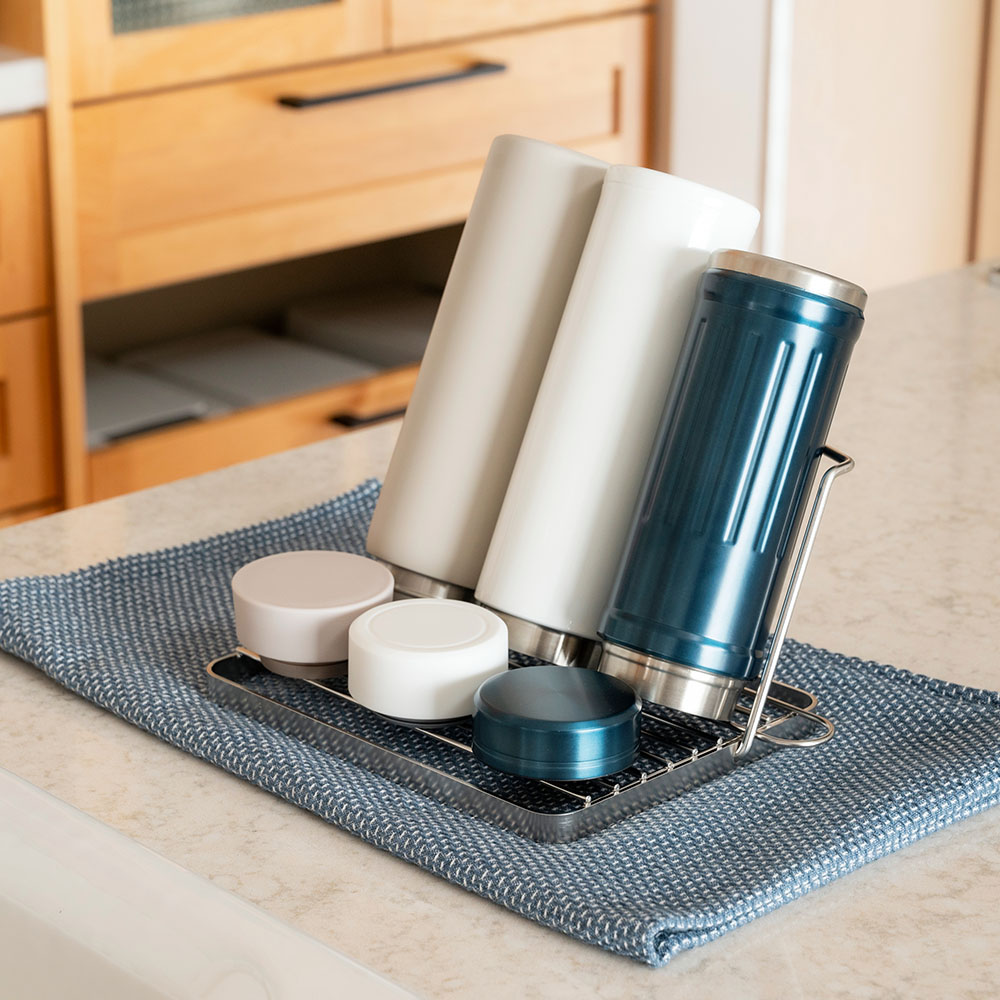 他にもペットボトルやお皿、フライパンやフライパンの取っ手なども立てかけて乾かせます。水切りの際は吸水タオルや吸水マットなどを下に敷いてお使いください。底面は高さのあるフレームで水筒が吸水タオルに触れずに、乾きも早くて衛生的。