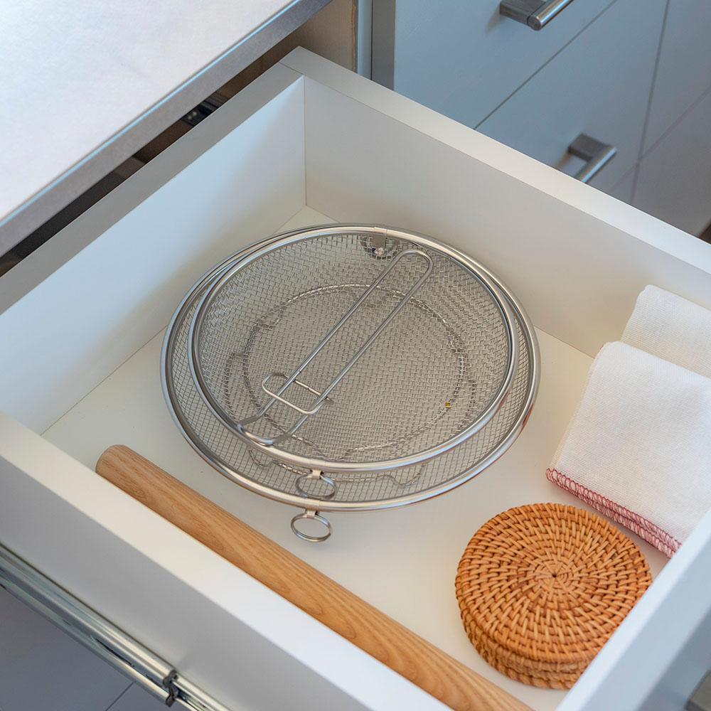 ザルとバットの良いところを凝縮したこの盆ざるは、多様な調理シーンで大活躍。食材の水切りや湯切りはもちろん、揚げ物の油切り、少量の食器水切りカゴとしてもお使いいただけます。キッチン周りの「あれこれ」をこれ一つで賄えるので、収納スペースもすっきり。まさに「すっきり暮らす」を実現するアイテムです。フライパンが蒸し器に!手軽にヘルシー蒸し料理