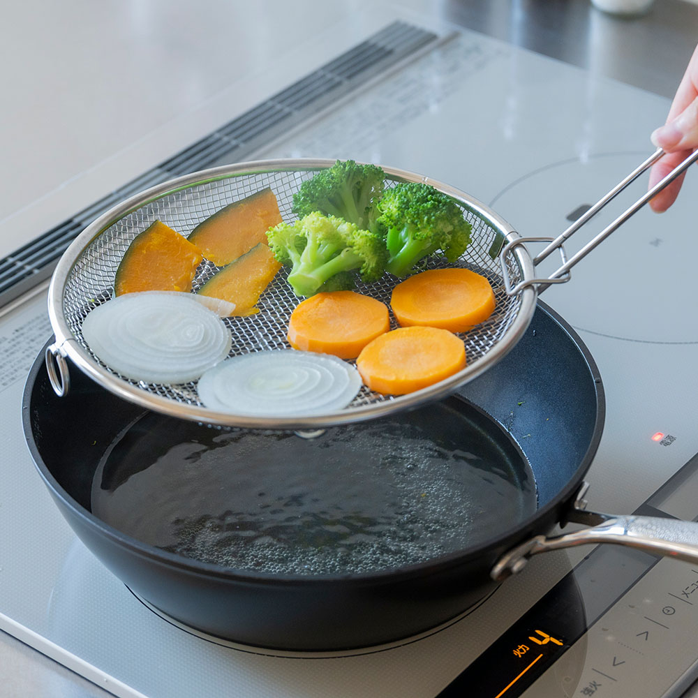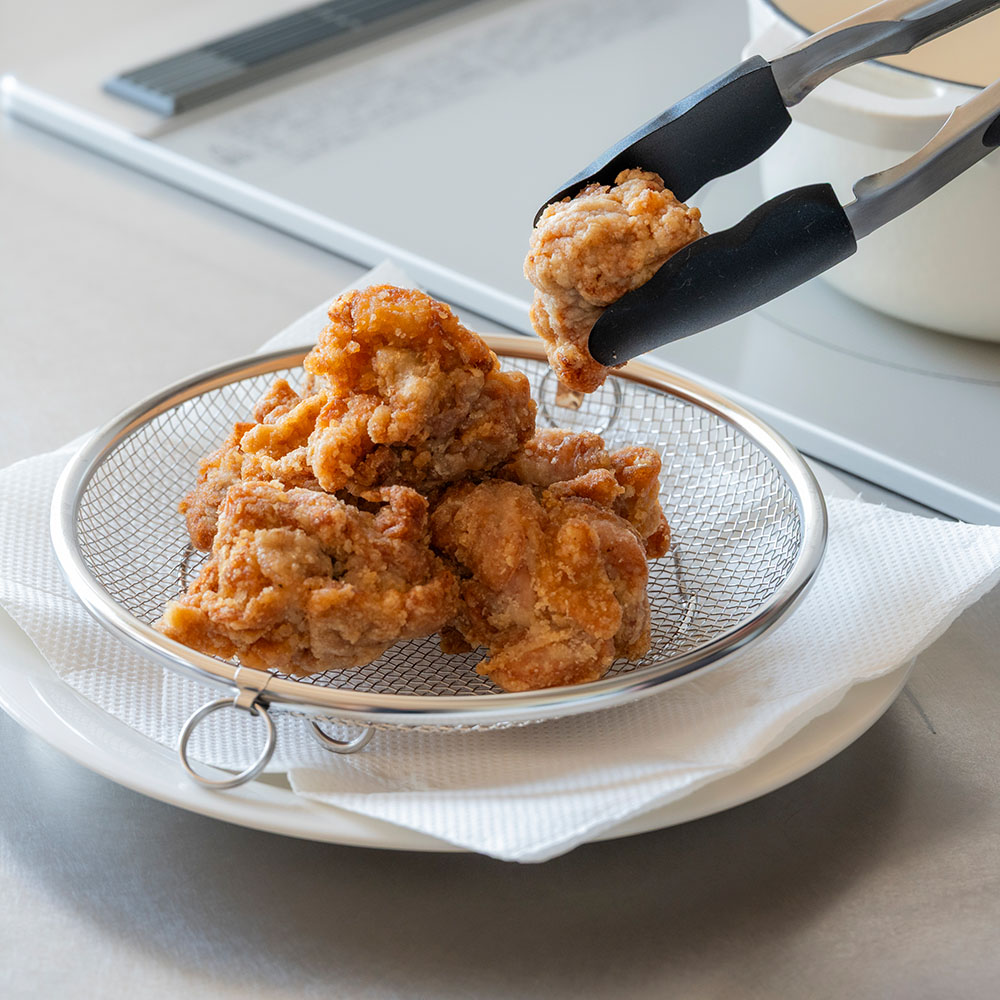 揚げ物の油切りに: 適度に粗い網目で、揚げたての唐揚げや天ぷらの油をしっかり切ります。