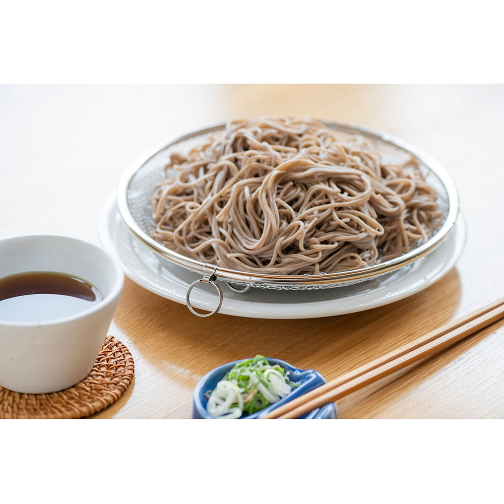 ざるの両側にリング付き。リングをつかむことでザルを上下に振りやすく、茹で上がった麺もしっかり湯切りできます。