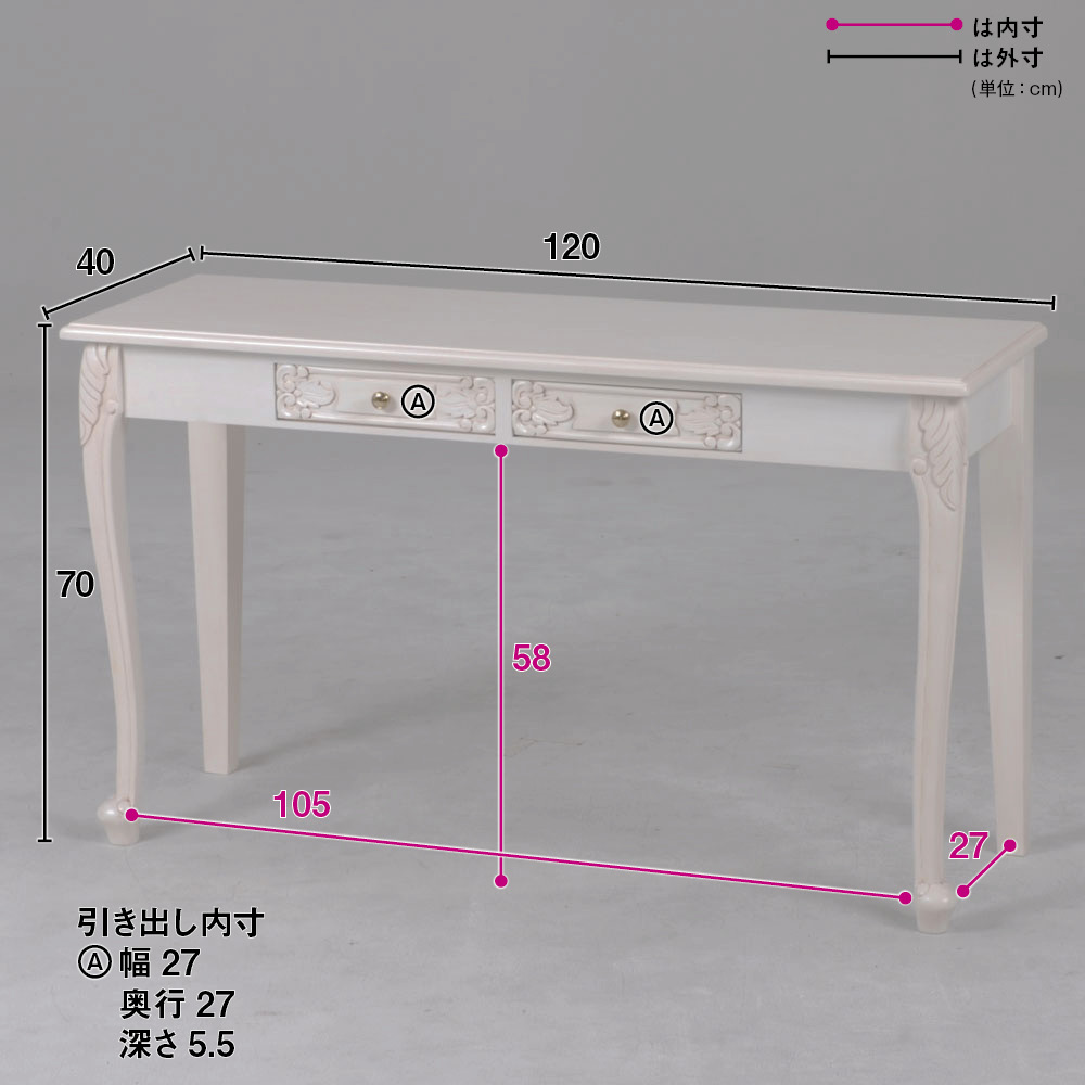 ■サイズ:幅120cm奥行40cm高さ70cm、重さ約14kg、引き出し奥行27cm