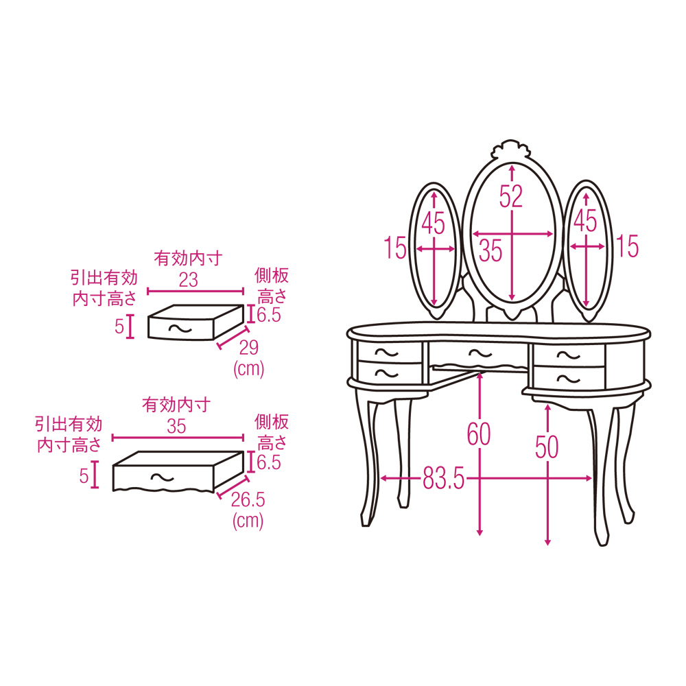 華やかでインテリアの主役になる、美しいデザインのドレッサーです。 ※スツールは商品に含まれません。