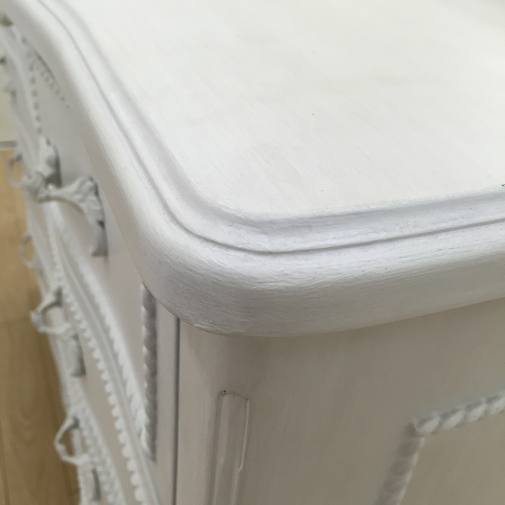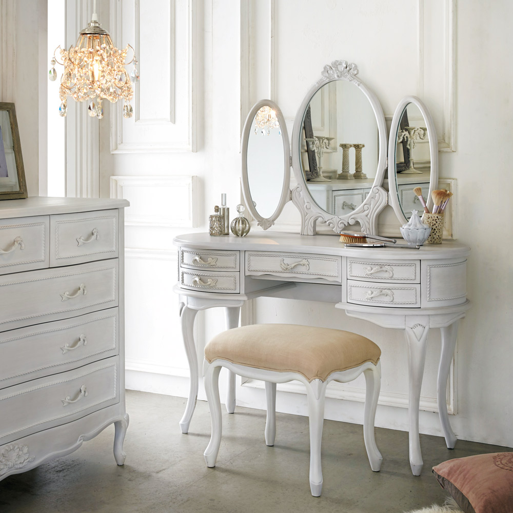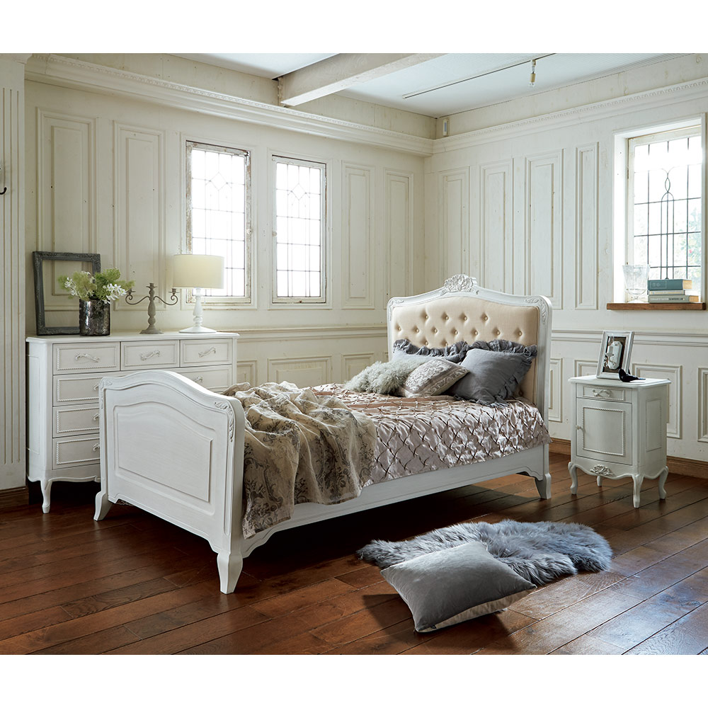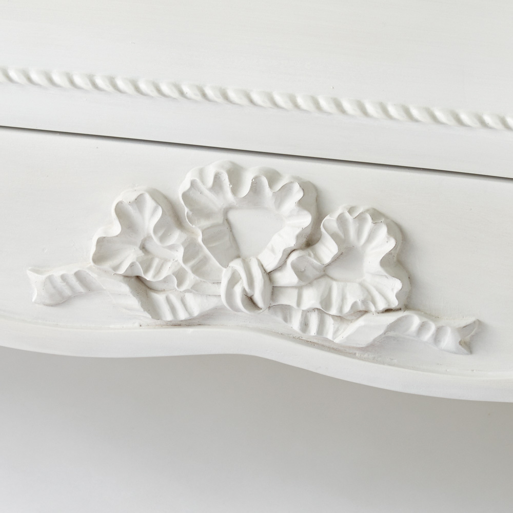 お洒落でクラシックなフォルムとポイント使いの優美なリボンモチーフで、憧れの空間が叶う大人の白家具シリーズです。グレー味のかかった落ち着いた白色なので、お部屋のインテリアになじみながら、上品に存在感を放ちます。
