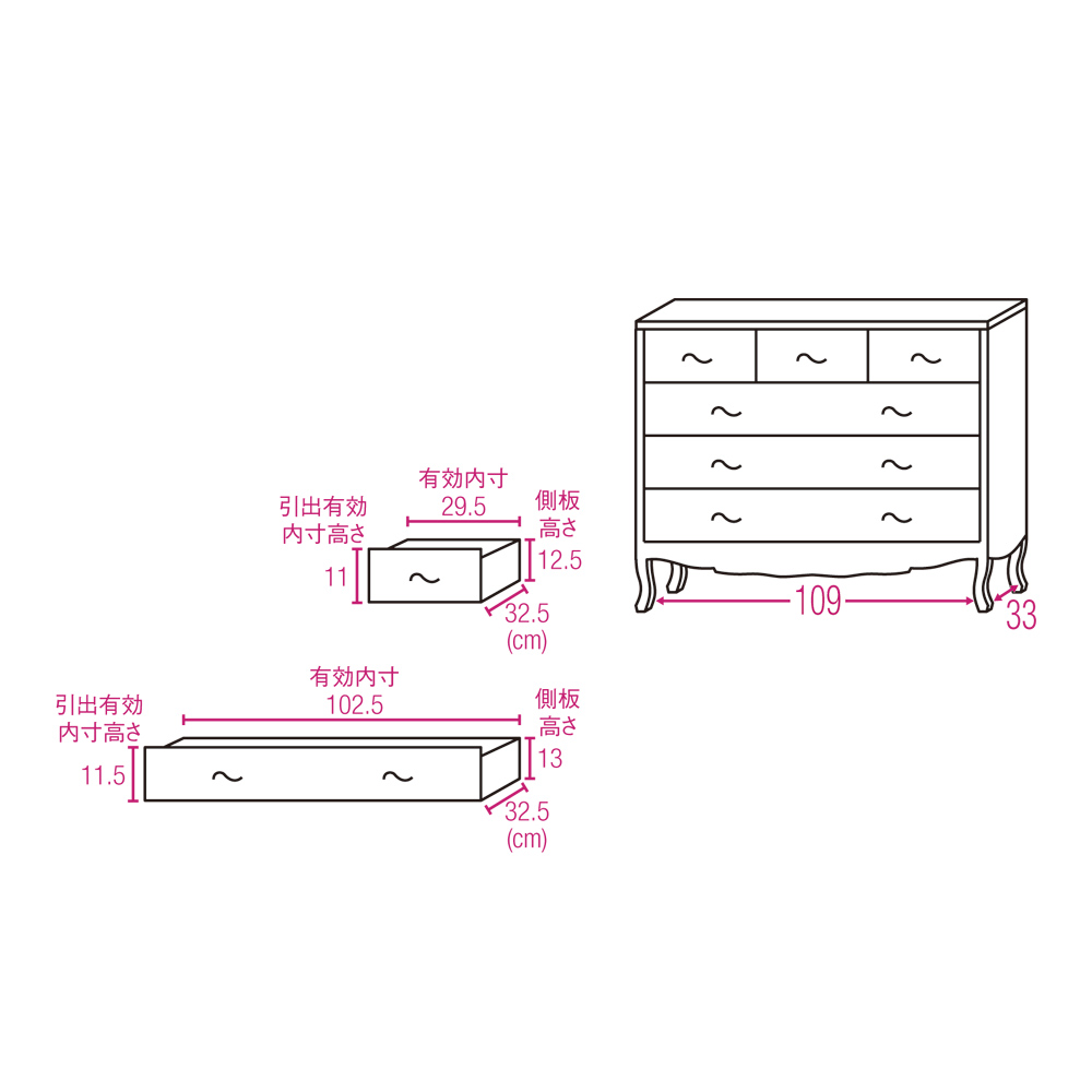 ◆靴下やストッキングなど、こまごました物や衣類収納に便利な小引き出しが3杯ついています。◆お気に入りの衣類をたたんでゆったりと収納できる、幅の広い引き出しも魅力です。