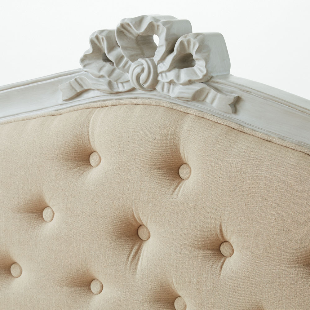 ヘッドボードはやわらかな布張りのボタン留め。もたれてくつろげます。