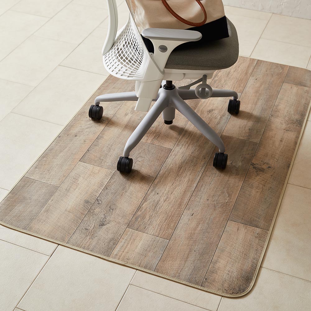 もともと店舗などの床材として開発された素材のため、厚み2.5mmと厚手のハイクオリティタイプ。(グレージュは約2.6mm)傷やへこみ、摩擦に強いので、キャスター付きのイスなどを使用するデスク下マットとしてもお勧めです。