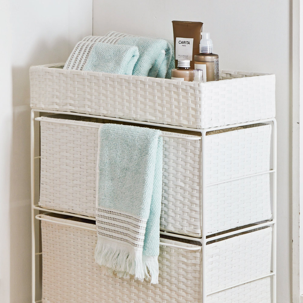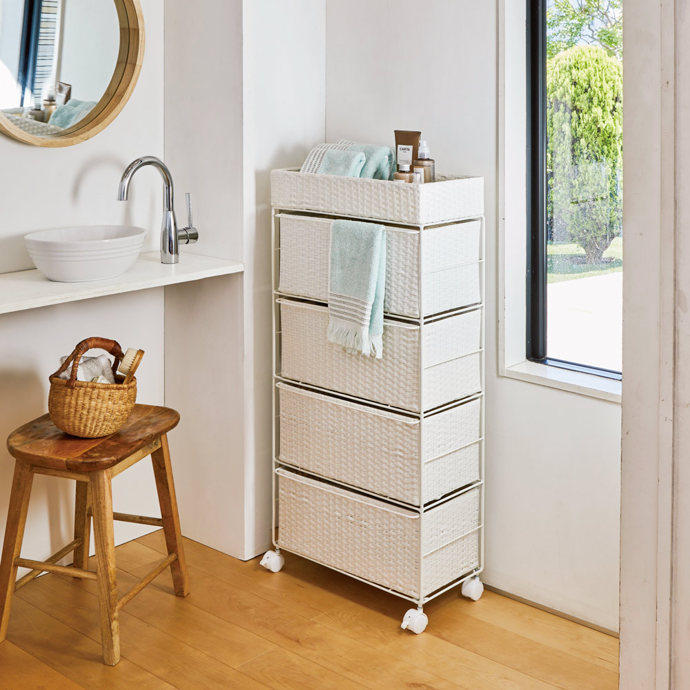 最上段のかごは、入浴後の着替えやタオルの一時置きにも便利。