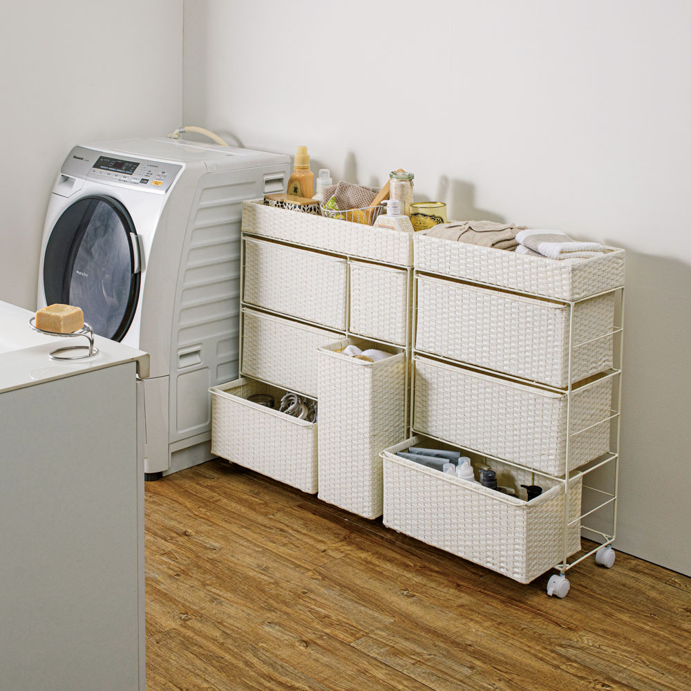 ●「洗面所に衣類チェストがあれば便利だけど、スペースが確保できない」とのお悩みに応える薄型タイプ。●奥行が28cm(キャスター含む)なので、洗面所や通路にタオルや着替えを置くことができ、お部屋まで取りに行く手間が省けます。