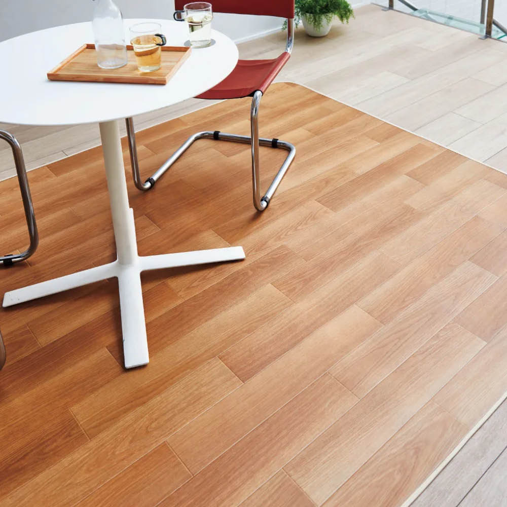 サンゲツの床シートを使用した、はっ水・防汚・抗菌と高機能な、クッションフロアプリントダイニングラグ。適度なクッション性で床をキズから守り、汚れてもサッと拭くだけ。
