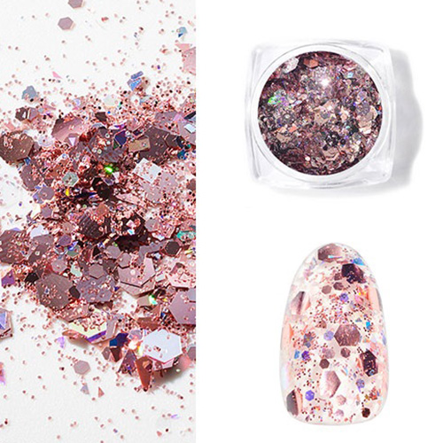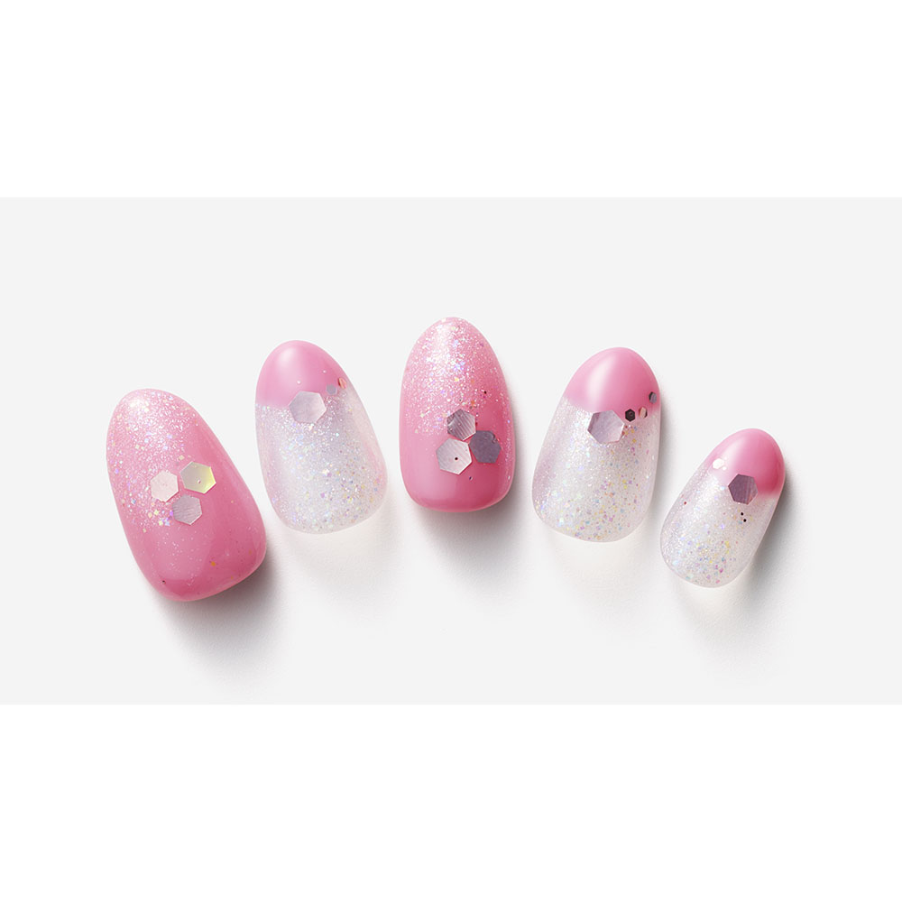 ネイルアートデザインイメージ:(1)別売りのスプリングタイム(ピンク)でベースを塗ってから別売りのLEDライトで硬化(2)クリアを塗りランダムホロカットを散らし硬化(3)プリズム(クリアラメ)をお好みで重ねて硬化