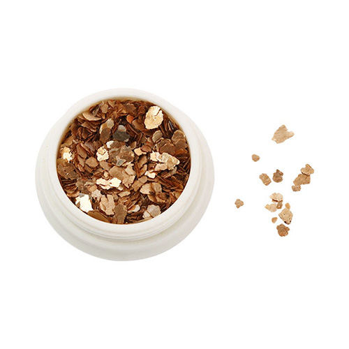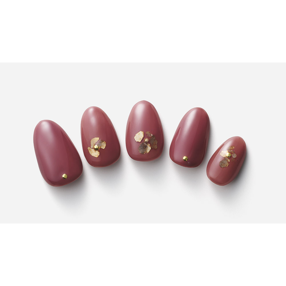 ネイルアートデザインイメージ:(1)別売りのアンティックローズを塗り、別売りのLEDライトで硬化(2)クリアを塗り、マイカフレークとスタッズゴールドを散らし硬化(3)クリアを重ね塗り、硬化