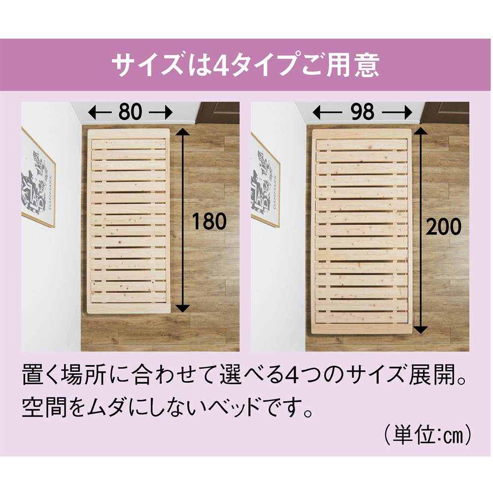 すのこ形状の床板は敷き布団使いもOK。通気性も確保する形状なので、清潔にお使いいただけます。~お子様からお年寄りまで。2台並べて、ご家族での使い方も~
