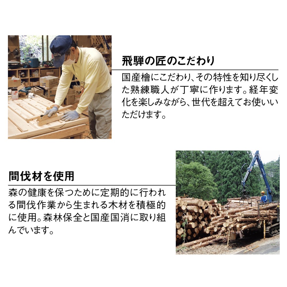 ◆岐阜県のブランドひのきとして全国に知られる飛騨の銘柄材【東濃檜】を100%使用。◆古くから高度な木工技術を育んできた飛騨地方で、ものづくりの技を受け継ぐ匠たちが造り上げました。