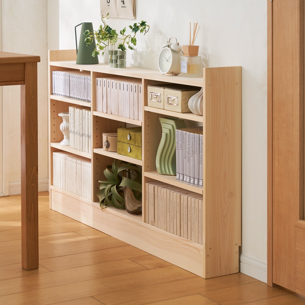 使用例(左から幅90高さ100cm、幅120高さ100cm ※画像は奥行15cmのより薄型タイプです。)国産天然木の柔らかな表情が魅力、薄型収納ラックシリーズカウンター下や窓下、廊下など、デッドスペースになりがちな空間を実用的な収納スペースに変える、奥行21cmの薄型ラック。リビングダイニングなどの憩いの場にも調和する、天然木の質感を存分にいかしたシリーズです