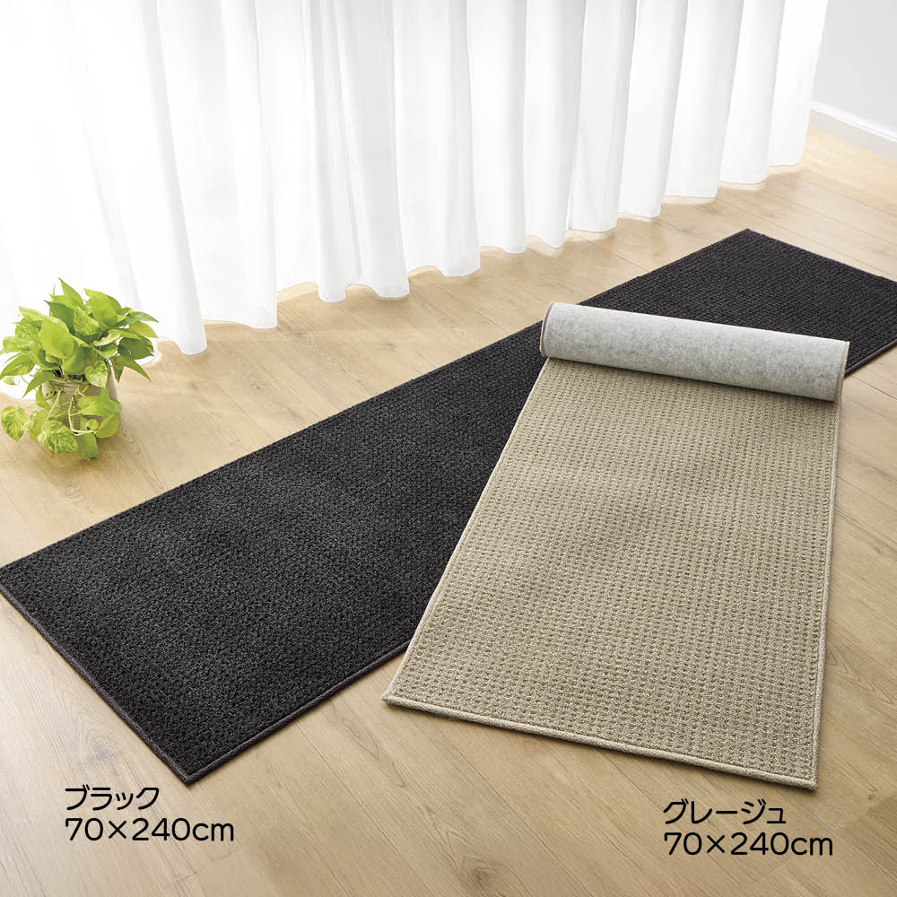 廊下の長さに合わせて選べる5つのサイズと、4色のカラーバリエーションご用意。お住まいの雰囲気に合わせてコーディネートでき、廊下を快適な空間に演出します。70×120cmサイズは玄関マットに使うのも◎。