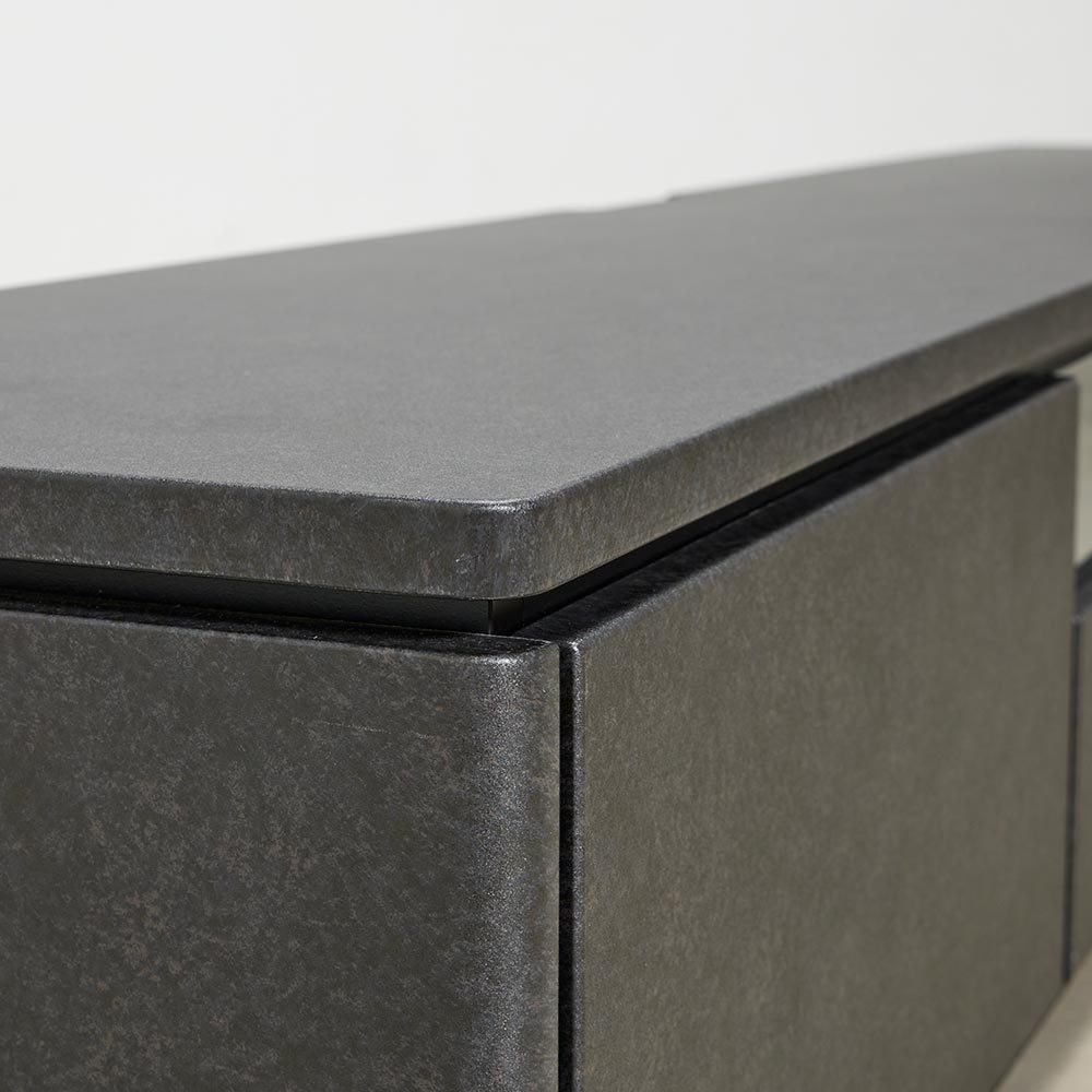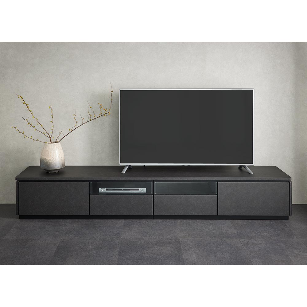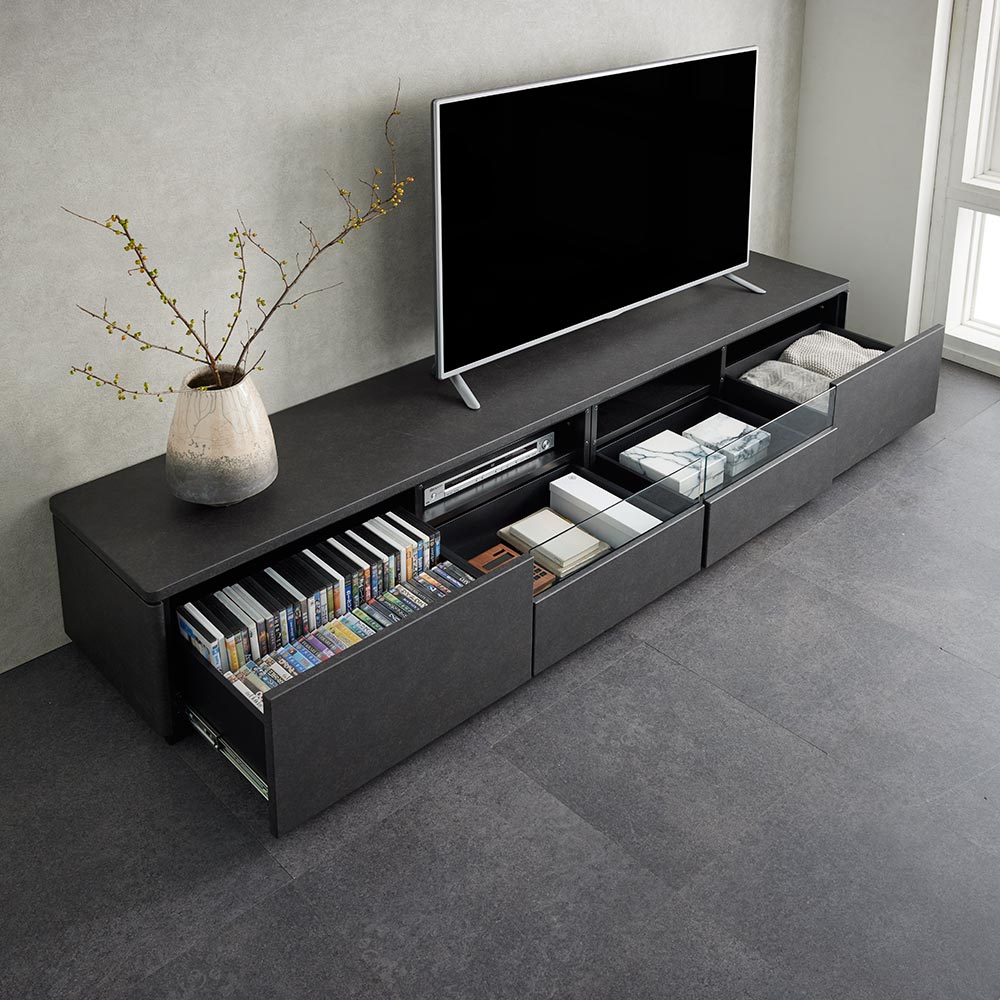 台輪はマットな黒で仕上げ、本体より内側に設置されており、正面から見ると宙に浮いているよう。まるで造り付けのフロートテレビボードのようなモダンな印象のローボードです。画像は幅180cmタイプ。
