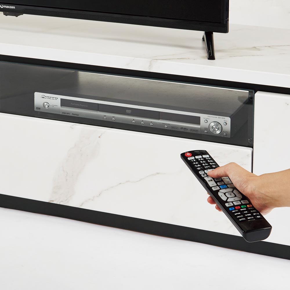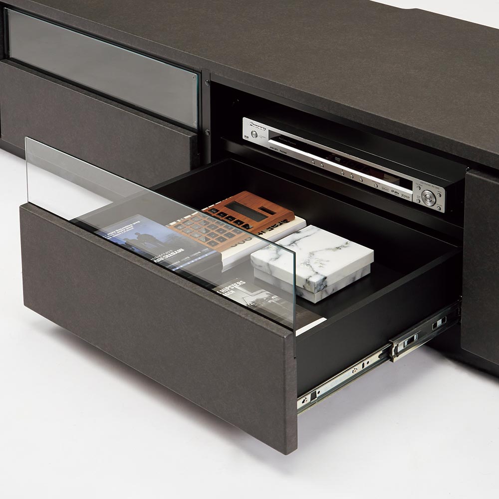 中央の引き出し2つには5mm厚のガラス窓仕様。閉めたままリモコン操作が可能です。
