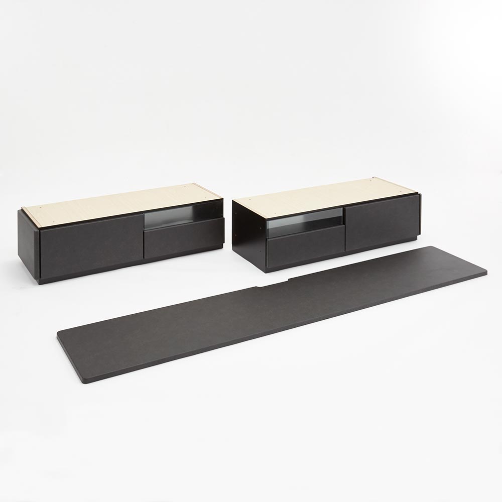 商品を天板と引き出し2つずつの3個口に分け、狭めな玄関だと搬入しづらい大型テレビボードを搬入しやすくしました。