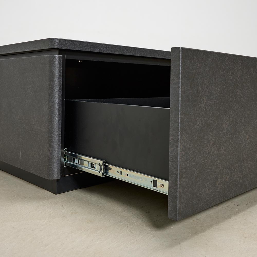 ■中央の引き出し2つには5mm厚のガラス窓仕様。閉めたままリモコン操作が可能です。また強化ガラスを使用しているため、万一破損しても鈍角の細かい粒状になるので安心です。