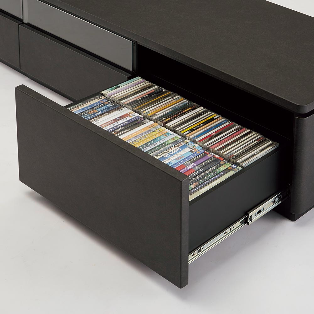 外側2つの引き出しには見やすいよう背表紙を向けてDVDをたっぷり収納できます。また全てスライドレール付きなので開閉もスムーズです。