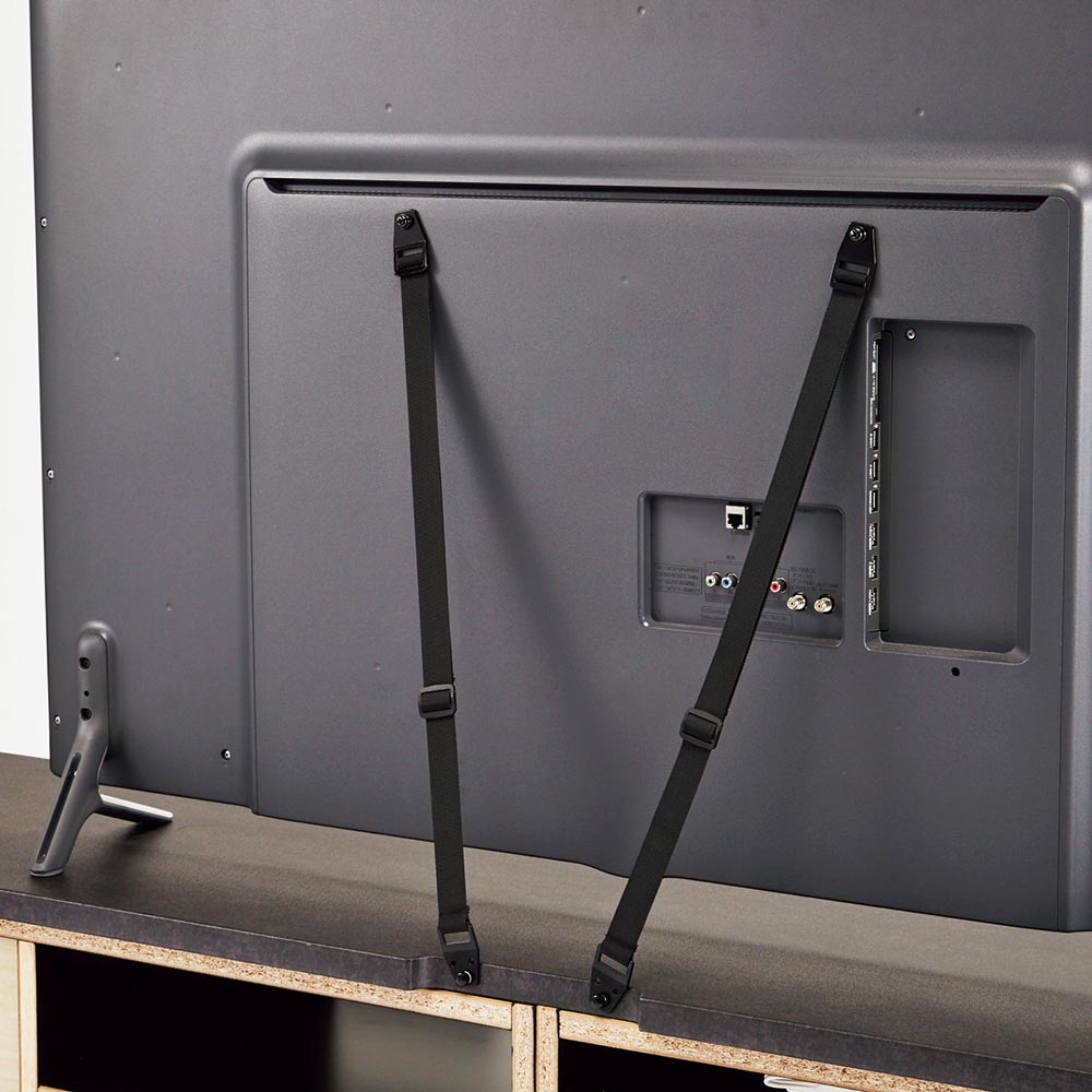 天板の配線通し部分には市販のTV転倒防止ベルトを固定でき、地震などもしもの時も安心です。(※ベルトは付属しておりません。)