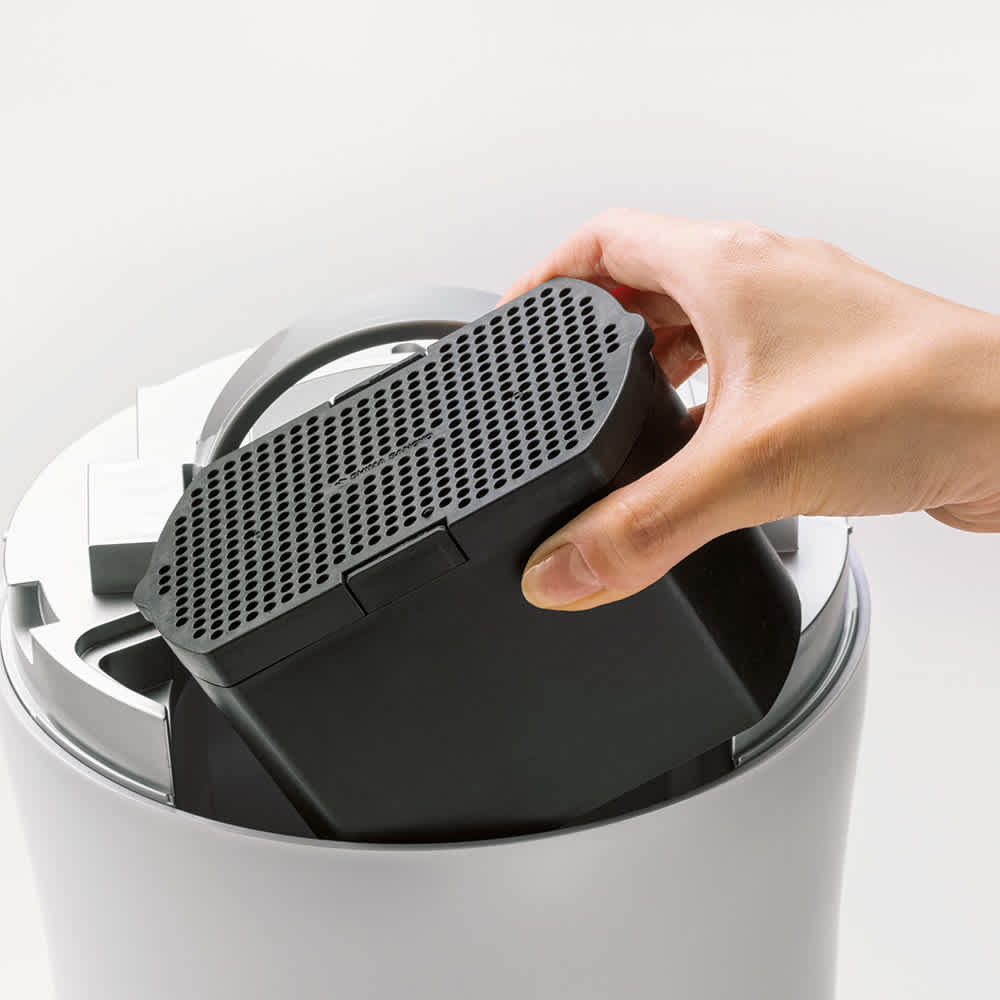 生ごみをパリパリに乾燥させることで、体積をなんと約1/5ほどに圧縮できるんです。だから処分するのも、肥料として庭やプランターに撒くのも本当に手軽。溜まっていく生ごみを収集日まで保管するストレスから開放してくれます。活性炭の力で、ニオイを軽減します。