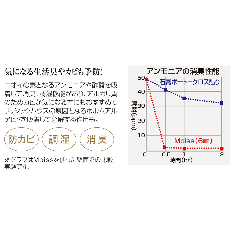 内装用モイスは調湿性能に優れており、本商品は内装用モイスを使用しています。
