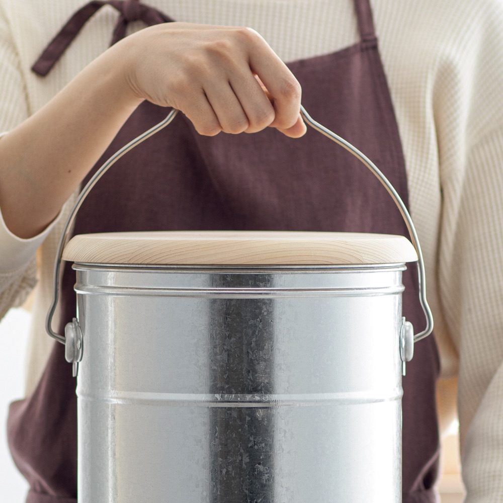 ■素材:トタン材(亜鉛メッキ鋼板)、フタ…ヒノキ天然木、計量カップ…ステンレス