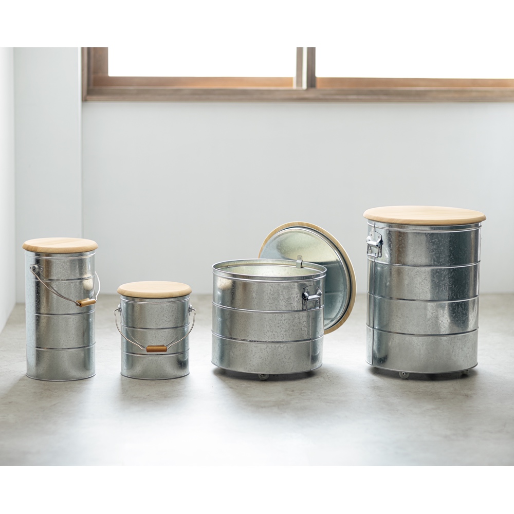 フタに岐阜県の東濃ひのきを使用した、トタン製の特別なライスストッカー。 ※写真は左から10kg・5kg・20kg・30kg