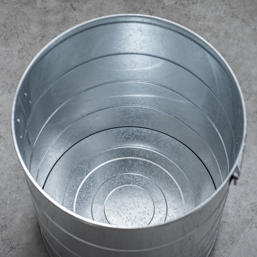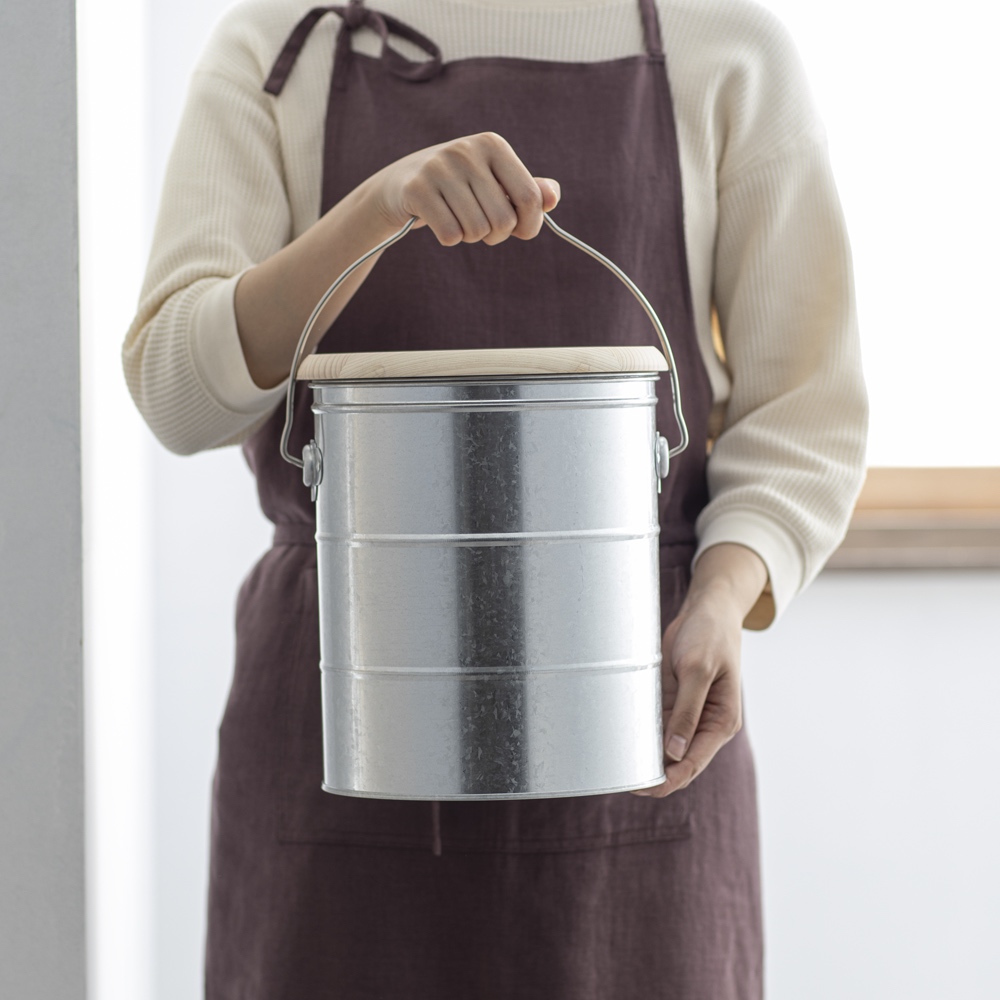 本体は屋根材としても使用されるほどサビに強く、水洗いが可能!トタン材には日本の老舗鉄鋼メーカー「淀川製鋼所」のトタン材を使用。さらに口部はトタン材を2枚合わせて加工することで、変形しにくく頑丈になっています。加工時、接着剤など一切使用せずに昔ながらの圧着方式で加工。サビの一因となる要素を極力避けることで、耐久性も◎。汚れたらすぐ水洗いできるので、いつでも清潔にご使用いただけます。