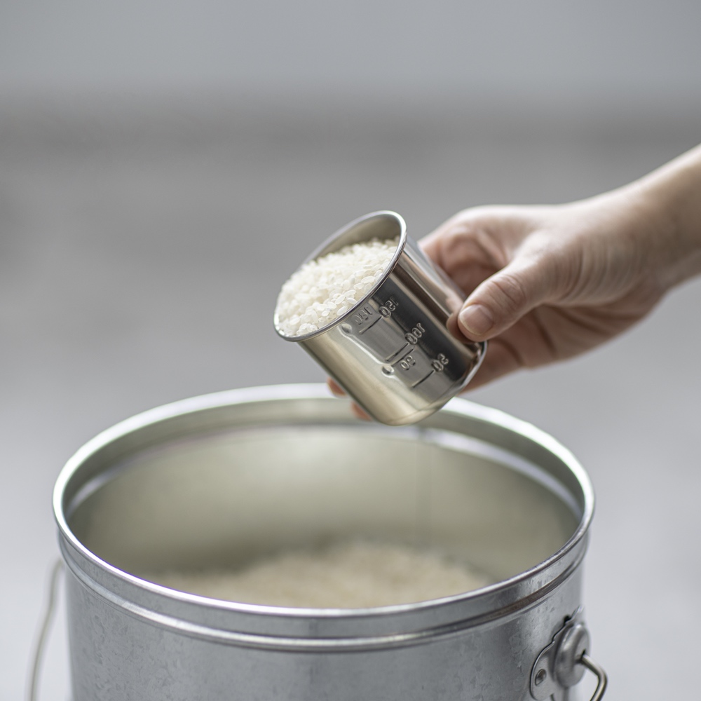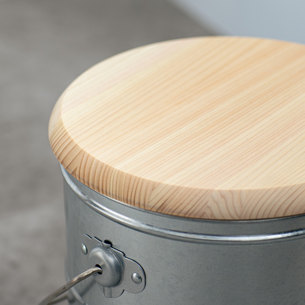 ■素材:トタン材(亜鉛メッキ鋼板)、フタ…ヒノキ天然木、計量カップ…ステンレス