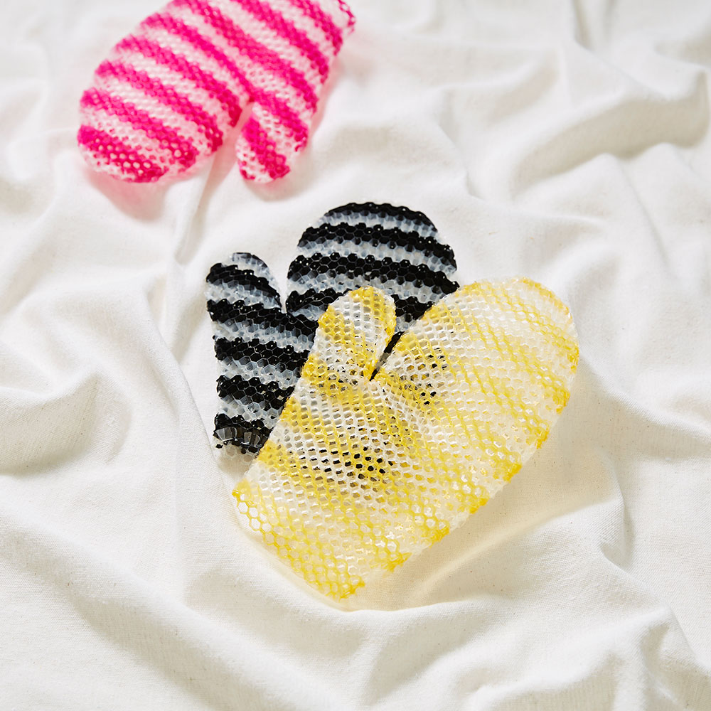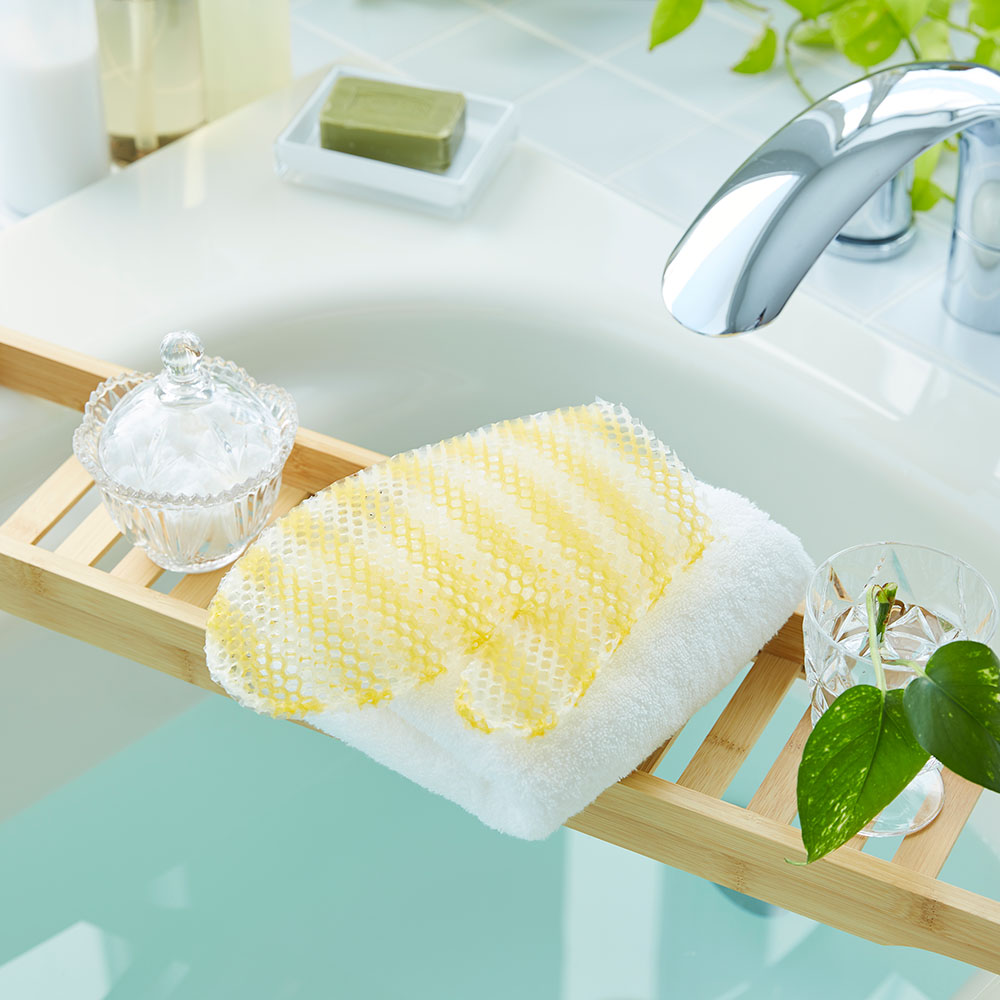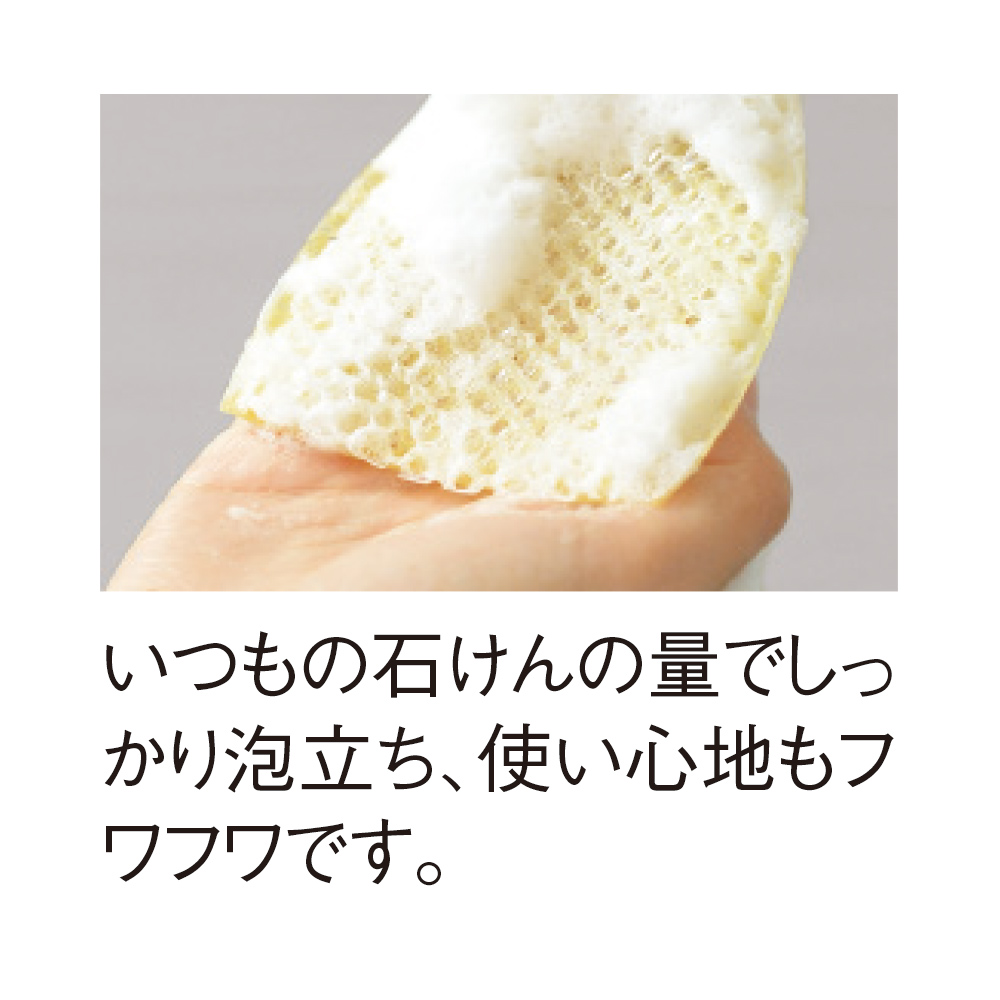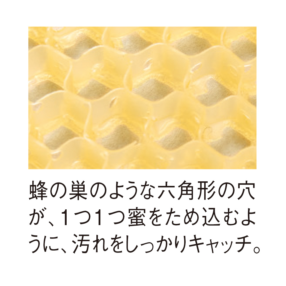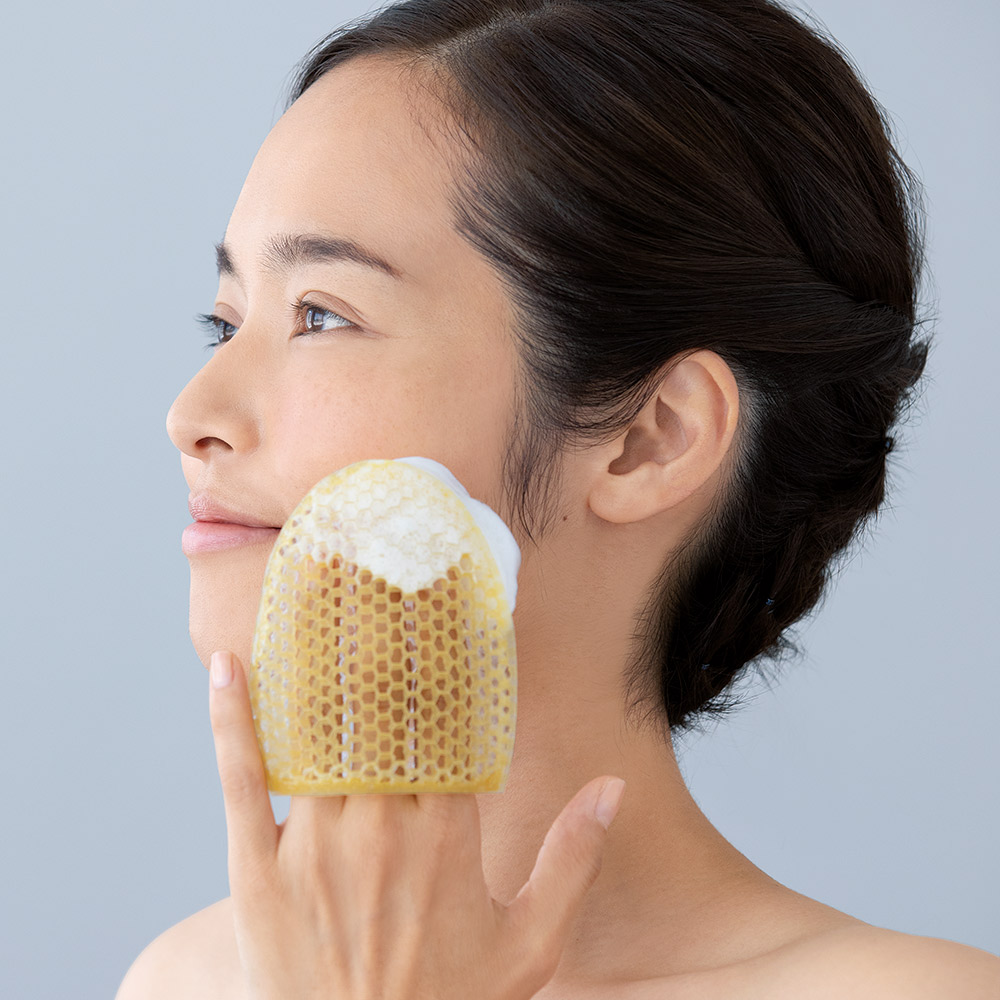 ハチの巣をモチーフにしたハニカム構造が、肌にピタリとフィット。古い角質、毛穴の汚れをしっかりと抱え込み、ツルツルに洗い上げます。たくさんの穴があいていることで泡立ちがよく、軽い力でクルクルとすべらせるだけで、しっかりと、優しい洗い上がりに。【ハニカム構造の特長】