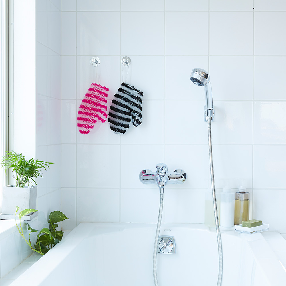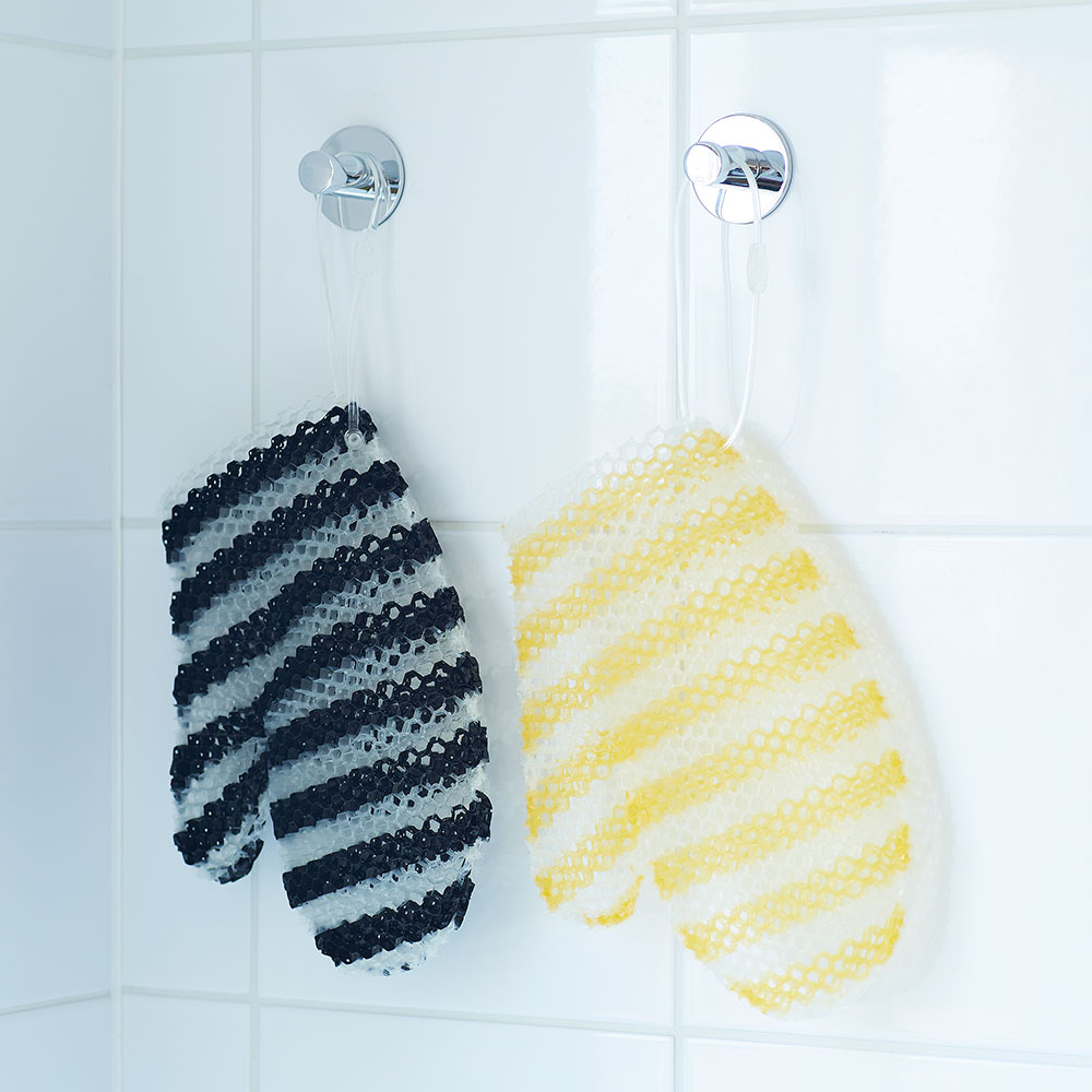 素材には、医療現場で採用されているTPU(熱可塑性ポリウレタン樹脂)を使用。TPUフィルムは髪の毛1本ほどの極薄フィルムで、ゴムのような弾力性と、プラスティックのような耐久性を持っています。柔らかく肌に密着して汚れをかき出しながら、肌に負担をかけない優しい洗い心地です。手にはめて洗いやすいミットタイプ