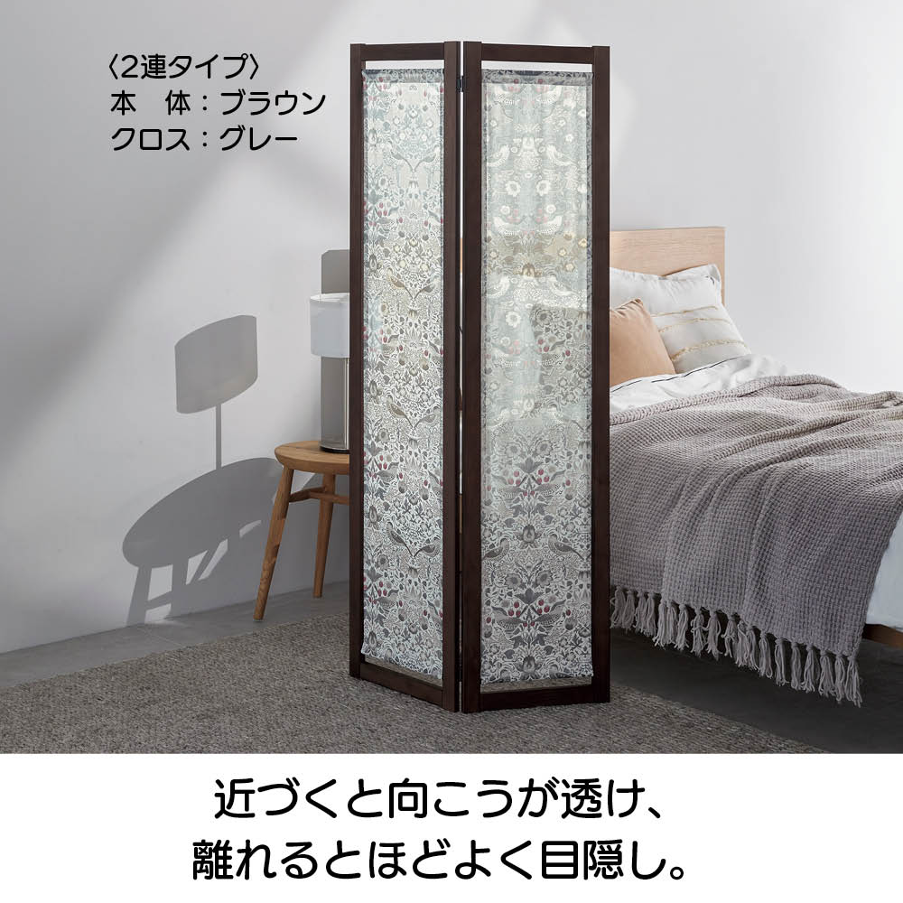 ほどよく空間を区切れる透け感のあるパーテーションとして使用。ウイリアム・モリスのテキスタイルが素敵です。陽の光を通すので、お部屋が暗くなることもなく、軽やかな印象に。