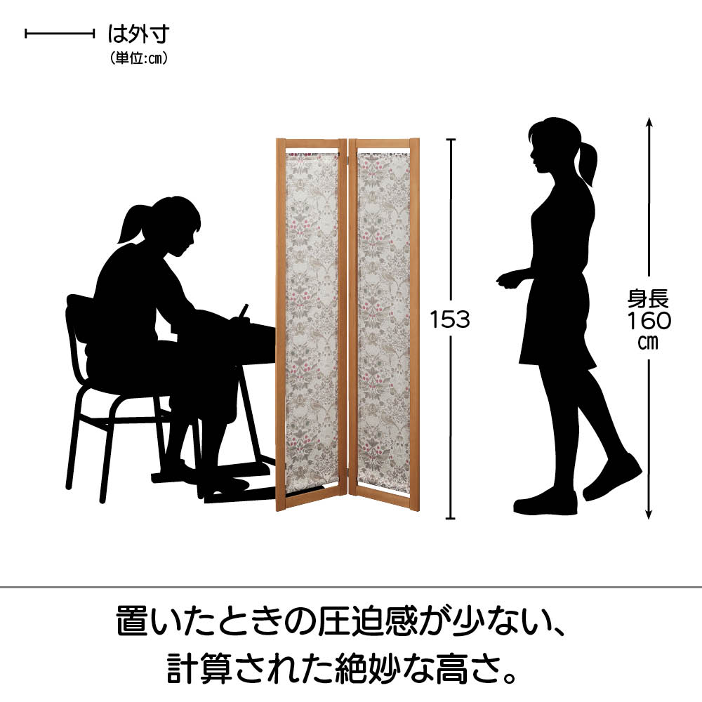 パーテーションクロスには、オパール加工で上品な透け感を施した、軽やかな素材感のテキスタイルを使用しています。陽の光を優しく通し、光の加減で柄の印象が繊細に変化して見えるのも魅力です。近づくと向こう側の様子がわかるくらいに透けて見え、離れるとほとんど見えなくなる……、この透け感は、お部屋の目隠しとしては絶妙!商品画像の説明