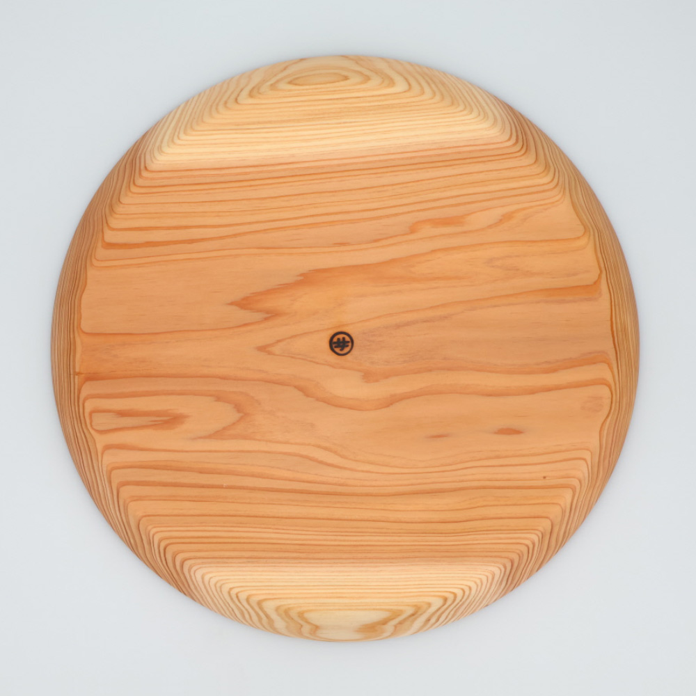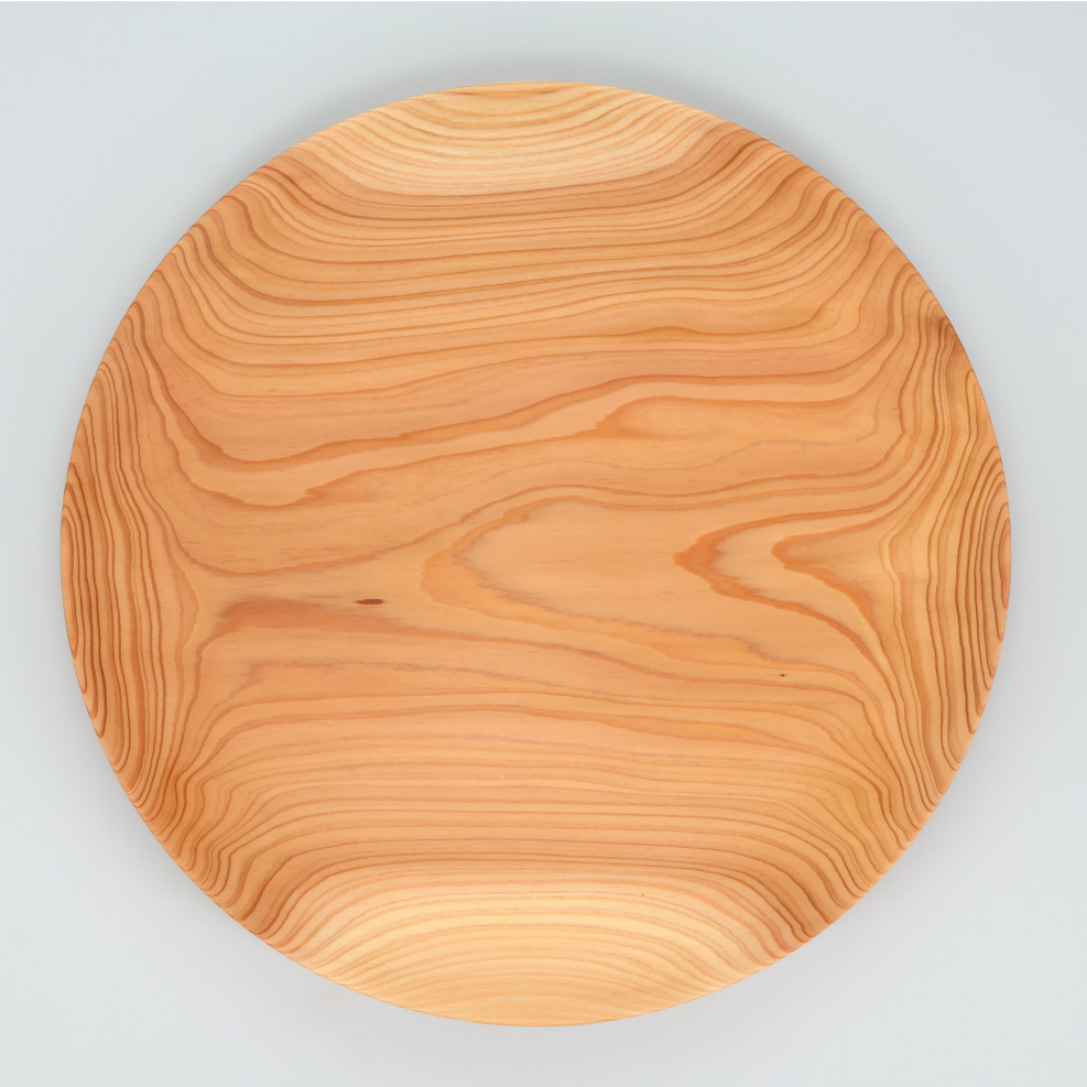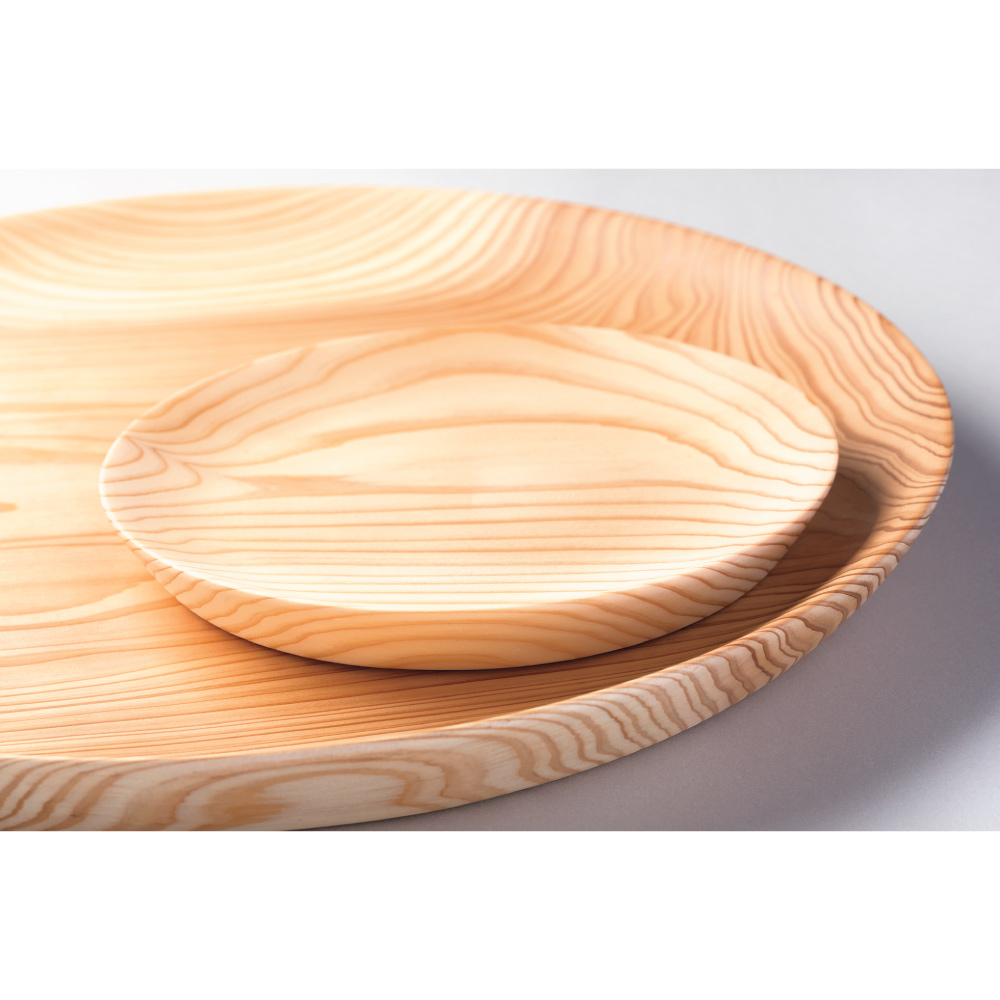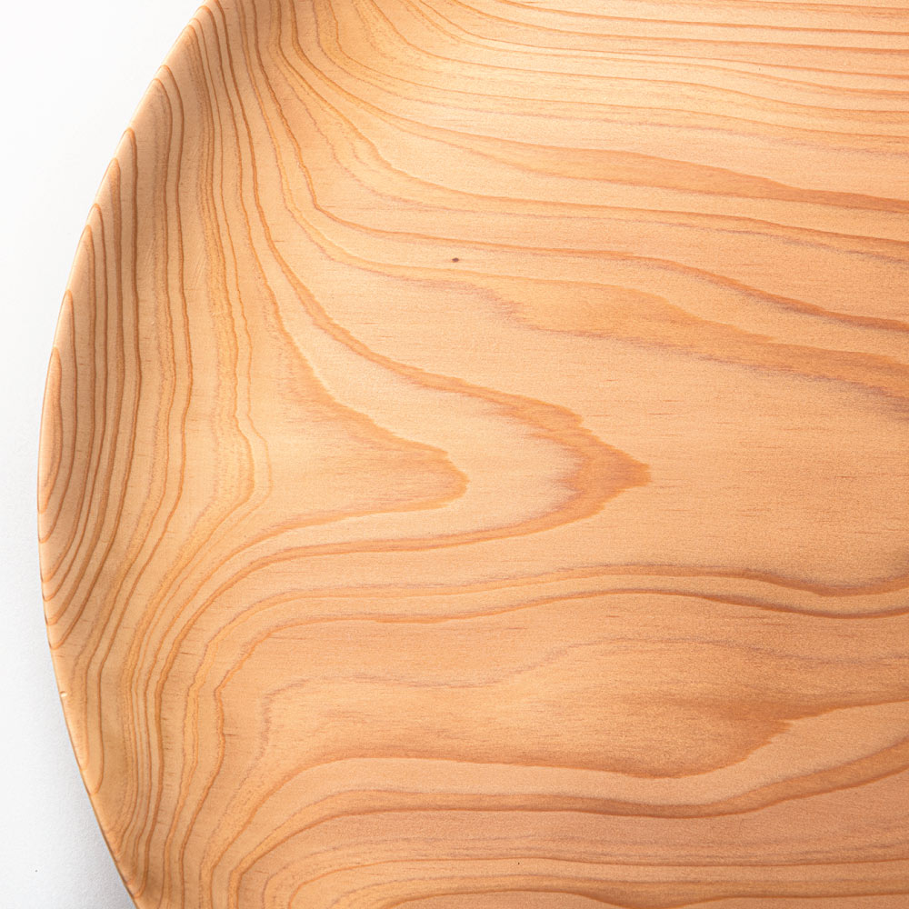 秋田杉は吸湿性や抗菌性に優れ、古くから伝統的な曲げわっぱ弁当箱に使用されています。この大皿は、繊細な木目と優しい肌触りが特徴で、陶器の半分以下という軽さも魅力です。厚みのあるデザインはそり防止の為と、手に持った時のぽってりとした持ちやすさを感じられます。