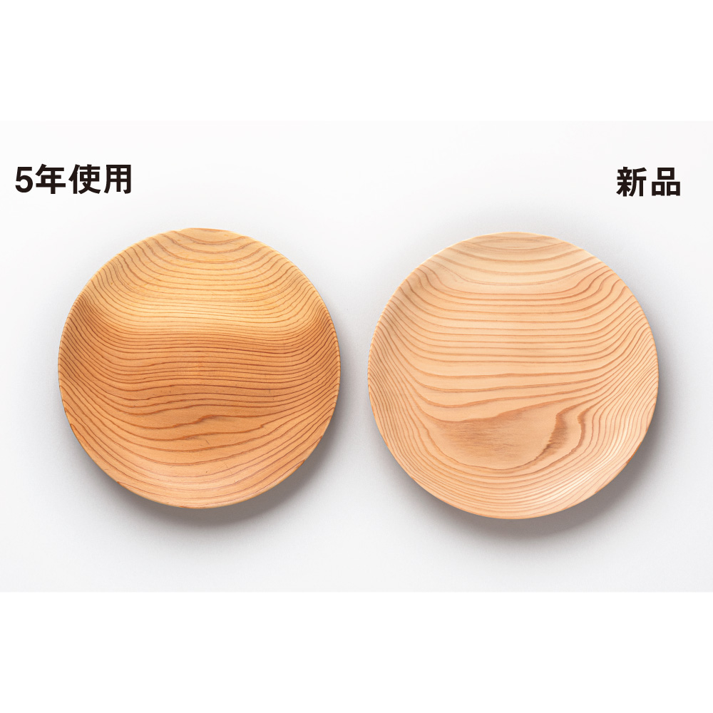 5年間にわたって使用された大皿も、新品と比べてもほぼ色移りがなく、使い込むほどに飴色に美しく変化しています。中性洗剤で簡単に洗えるので、忙しい日常でも負担が少なく、いつでも清潔に保つことができます。