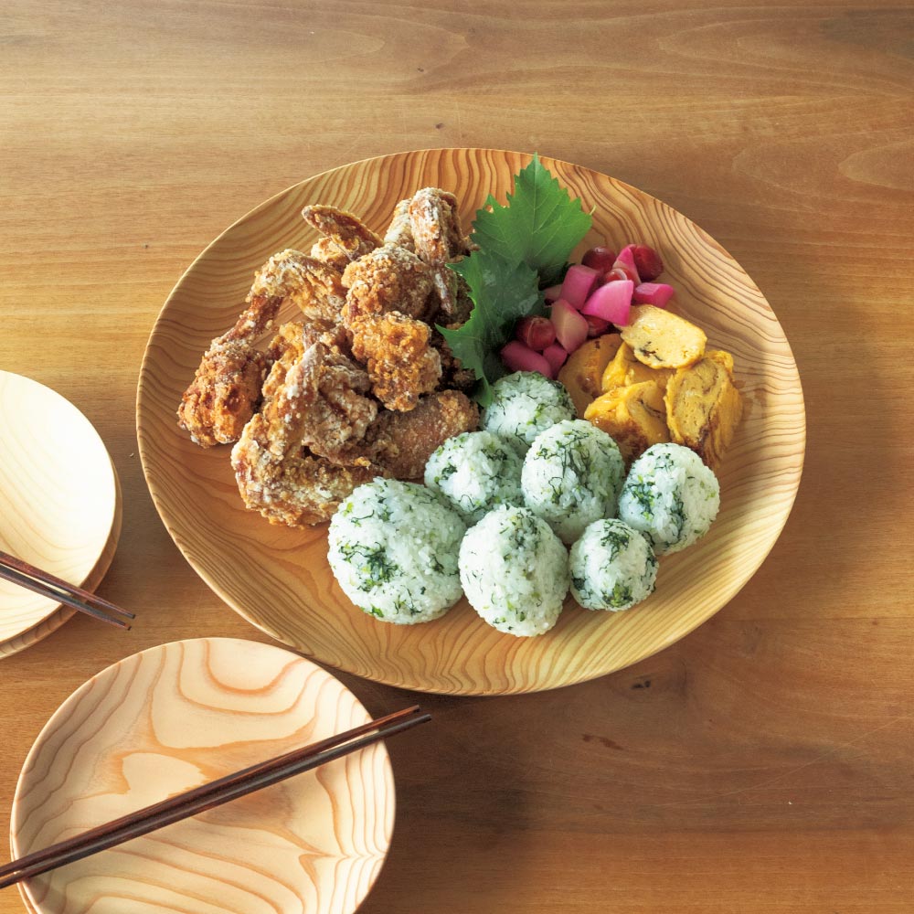 大皿料理は、取り分けて食べる楽しさを引き出します。有元葉子さんも「私の実家では昔から、大皿や大鉢にたっぷり盛り、各人が食べたいだけ取り分けて食べていました。そっちの方が料理がおおらかで気取りがなく、私は好きです。おむすびと唐揚げという、なんてことない料理でも、大皿にするとご馳走にみえるんですよね。」と大皿でのスタイルを提唱。木の大皿は、和食はもちろんのこと、パスタやサラダを盛り合わせたり、ハーブでマリネした肉を生野菜と共に盛り付けるエスニックな一品にも最適です。
