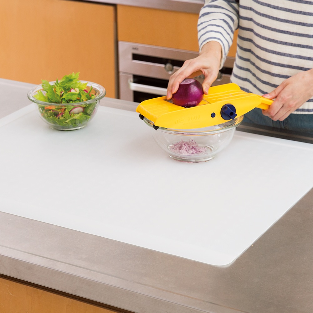 人工大理石やステンレスなど、傷つきやすい素材のキッチンカウンターを保護する半透明マット。でも、ただのマットではないんです!普段のお料理を快適にするための工夫が色々あります♪